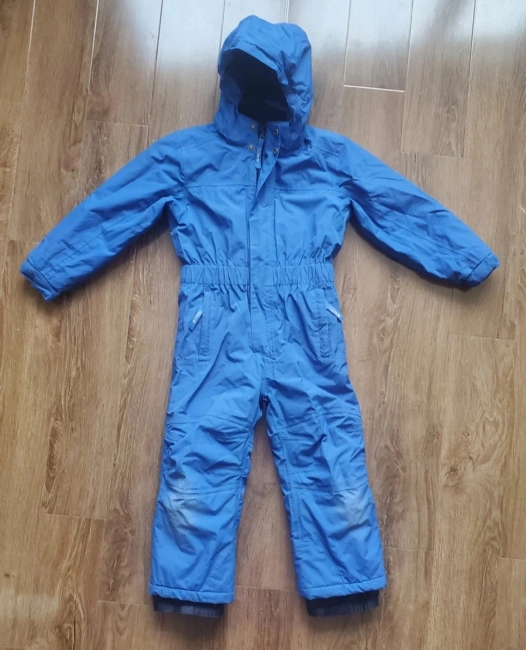 Blue kids' snowsuit. Size 5-6 years. Features a hood and full-length zip. Some minor wear and tear.