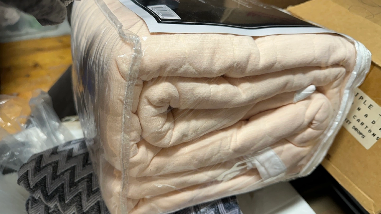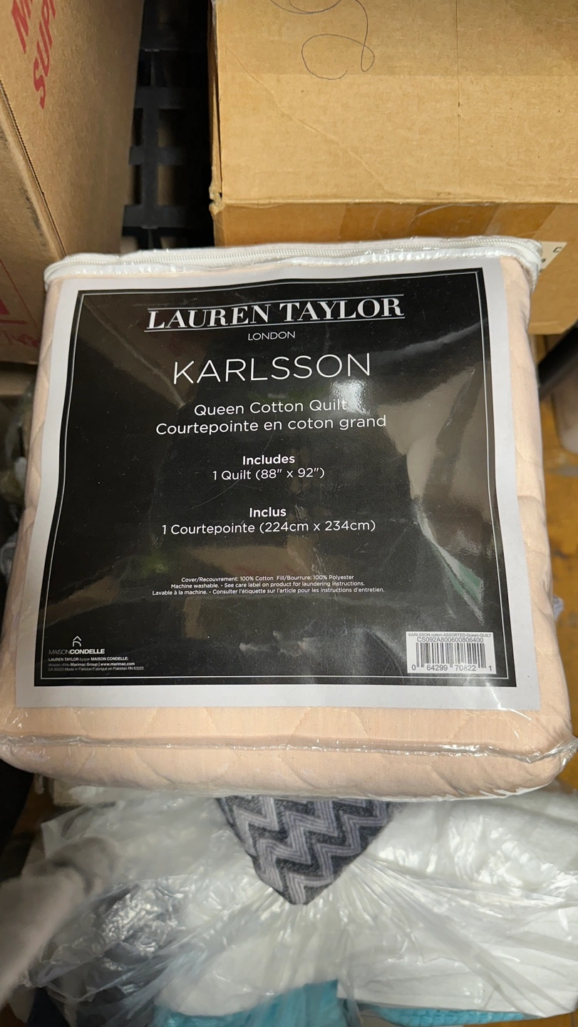 New queen-sized cotton quilt. Pale pink. Packaged. Measures 88" x 92".