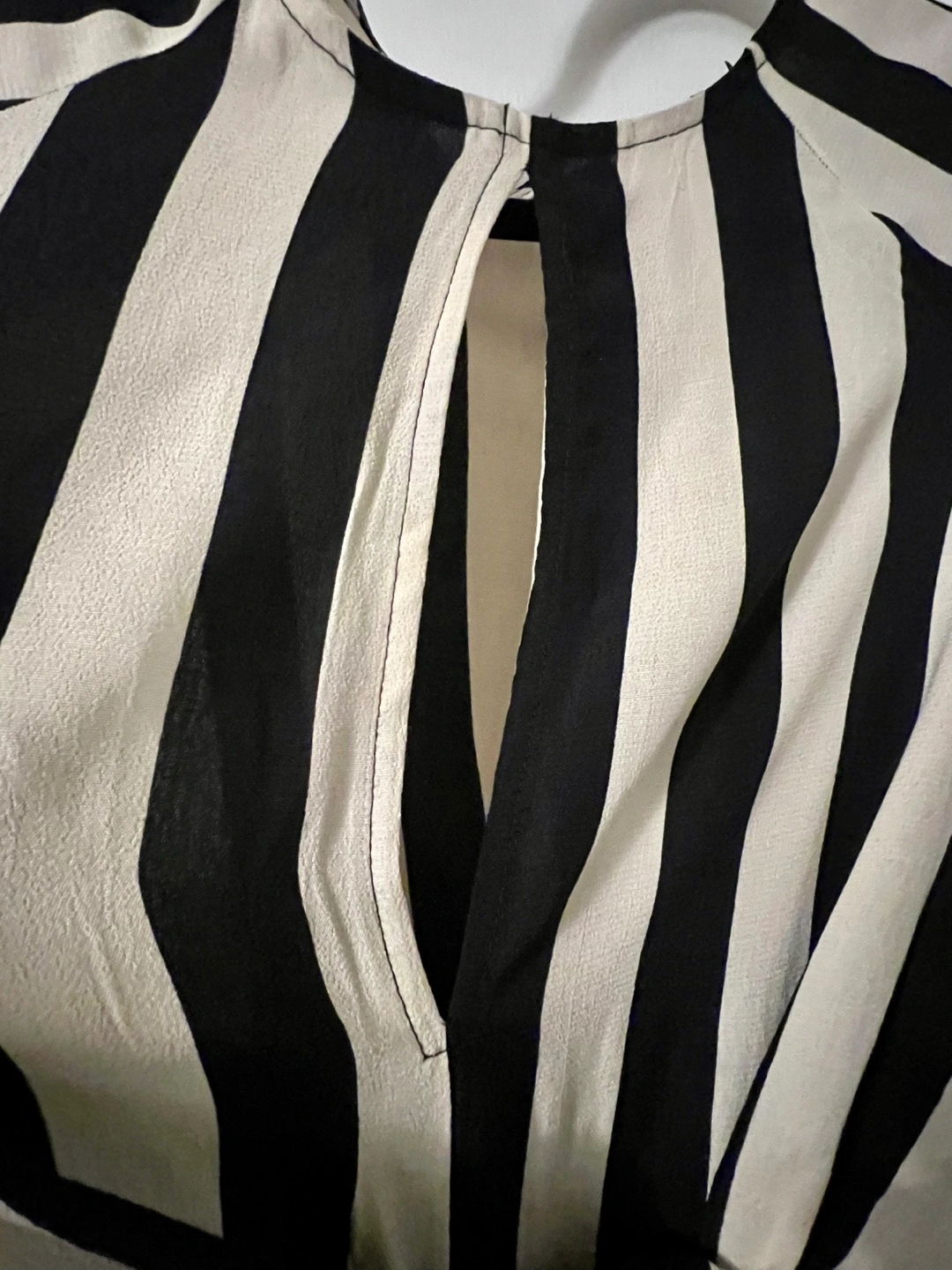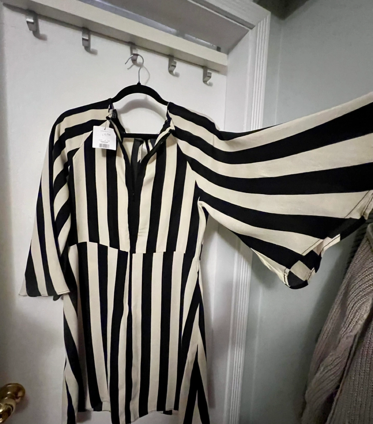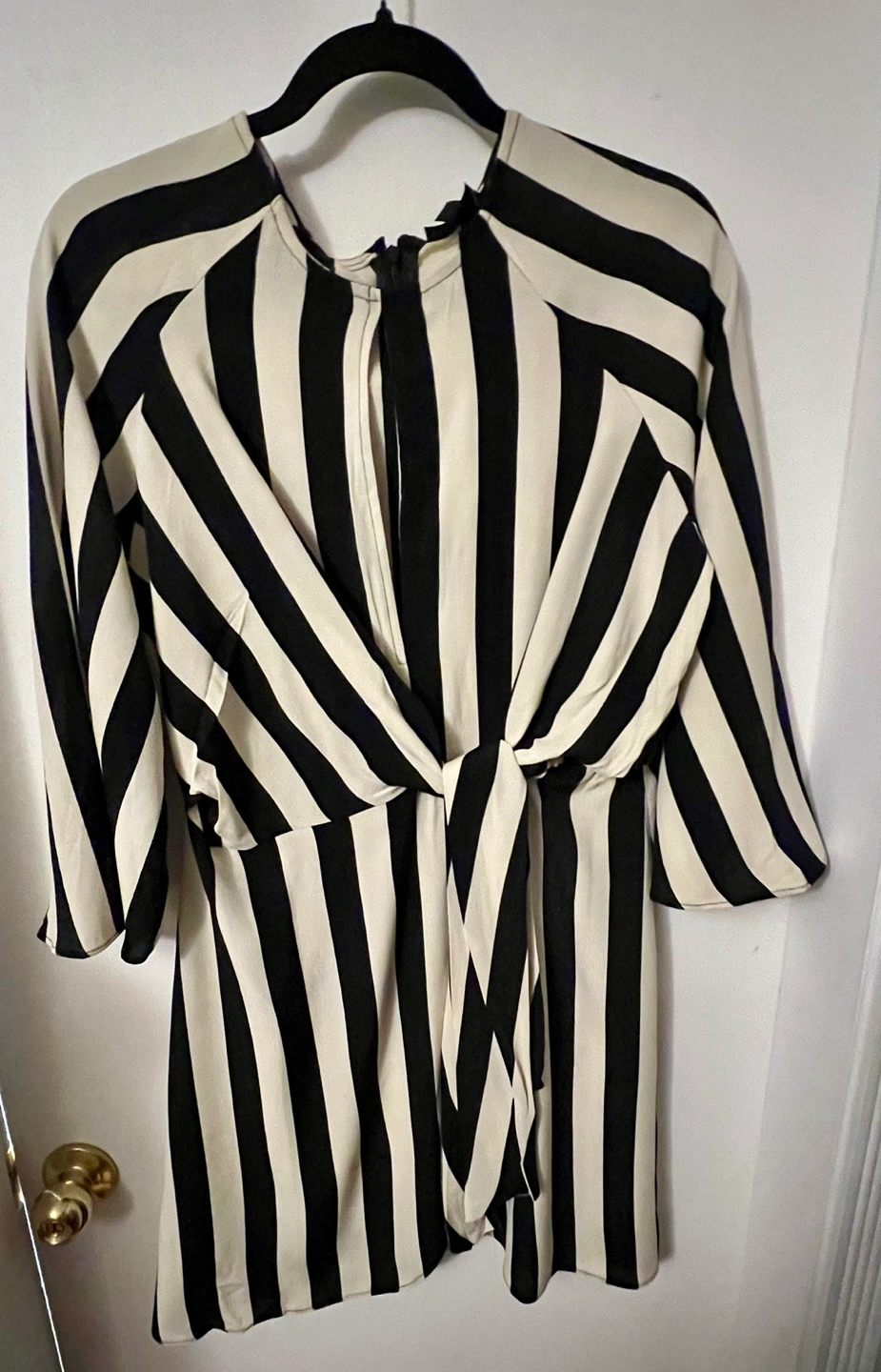 Striped mini dress. Black and white vertical stripes. Three-quarter sleeves. Keyhole detail at back. Size 10. (8 US or 12 UK)
