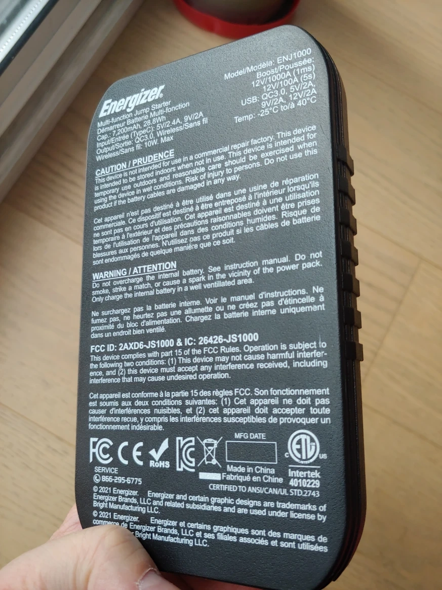 313Portable power bank with jump starter cables and carrying case. Features wireless charging capabilities. Multiple USB ports for charging devices. Compact and convenient design. Includes jumper cables and mesh carrying bag. Energerizer Multi-function Jump Starter Model: ENJ1000 Opened, Appears New and tested working well. Can Wireless Charge your iPhone (support wireless charging models) as power bank. Or use lightning cable to charge your iphone. Recharge by Type C cable to wall supply or car supply (NOT included) Portable, and very useful for car jumper Starter particularly in Winter seasons. See details from the below link: https://www.princessauto.com/en/1000a-li-ion-portable-jump-starter/product/PA0009044199?gad_source=1&gclid=Cj0KCQiAy8K8BhCZARIsAKJ8sfQwisS6onA12RkzvjbLVeZGZjymLaR9Hcs1N0n7zbK1Rc9Xc8TOWxIaAp6fEALw_wcB ####### What You See is What you Get = (WYSWYG) Sold AS IS condition and no return policy after the point of check out. Accept CASH only AND face to face trade ONLY. DO NOT accept PayPal or e-cheque! If ( you are a Scammer, please stay away from me by God's sake! Jesus Christ is God and can be your saviour too.) Location to pick up (use Google Map copy and paste ): 43°48'24.1"N 79°27'21.7"W Or use link in Google Chrome: https://maps.app.goo.gl It is the curbside “between units 87 and 88” of 735 New Westminster Drive, Thornhill, ON, where is the ground level leading to an entrance of a basement carpark, we trade there. Please click into my profile listings to see which may also fit your needs. Scammer: God Jesus Christ protects me! HE can be your saviour too if you repent and return to God TODAY!