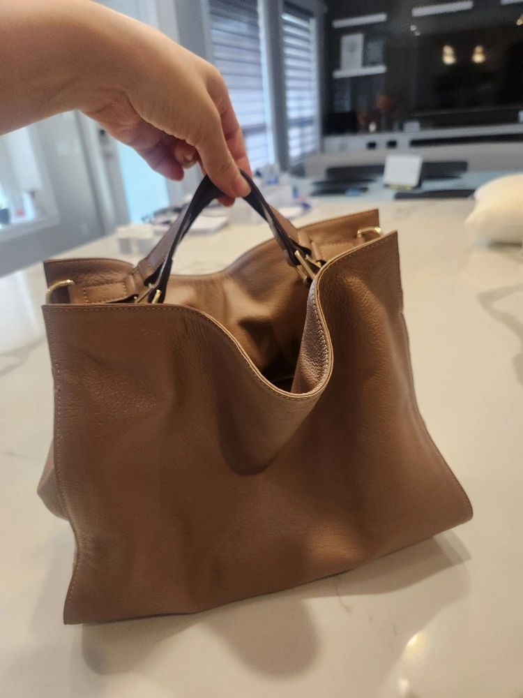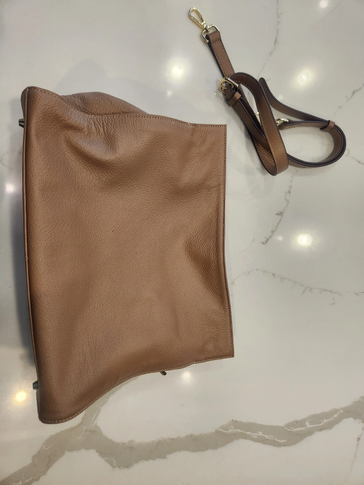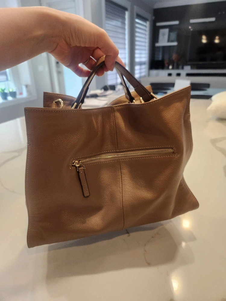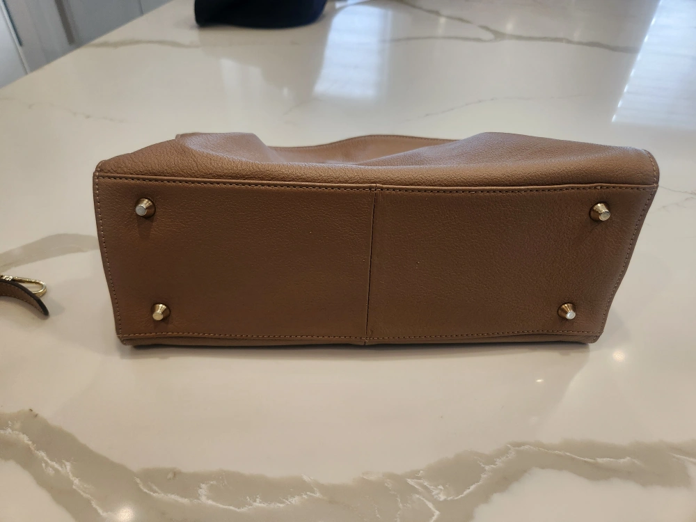 EUC Stylish calf leather handbag. Features top handles and a detachable shoulder strap. Light brown colour. Small zip pocket on the back. evoly & bloom, purchased at benatra for ~400$ cad - see receipt.