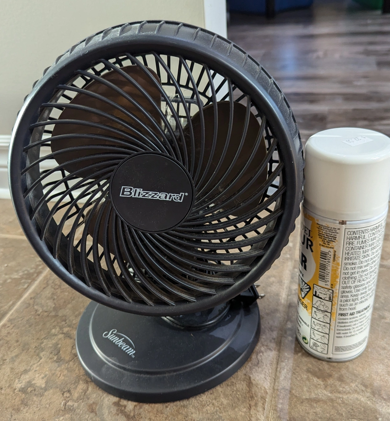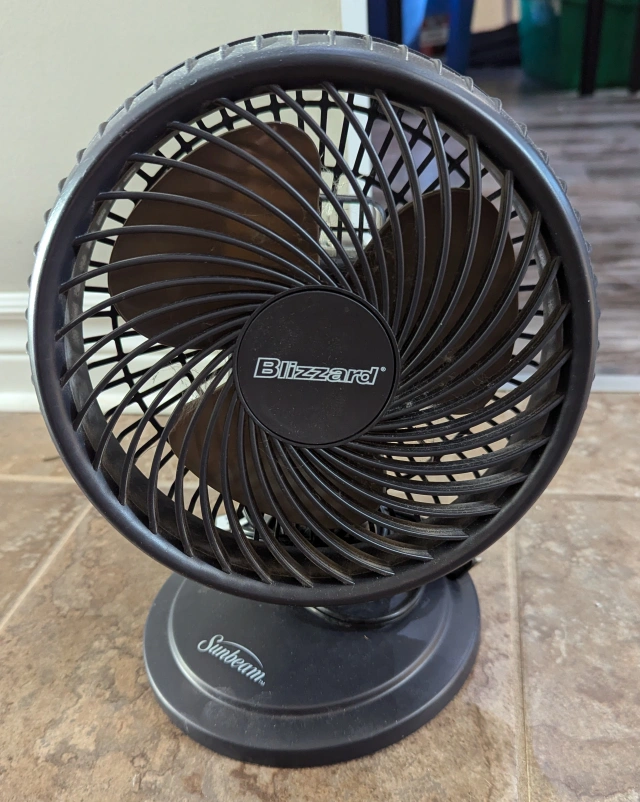 13Small, portable fan. Black plastic construction. Three bronze blades. Good for desks or tables. Spray paint can for size reference.