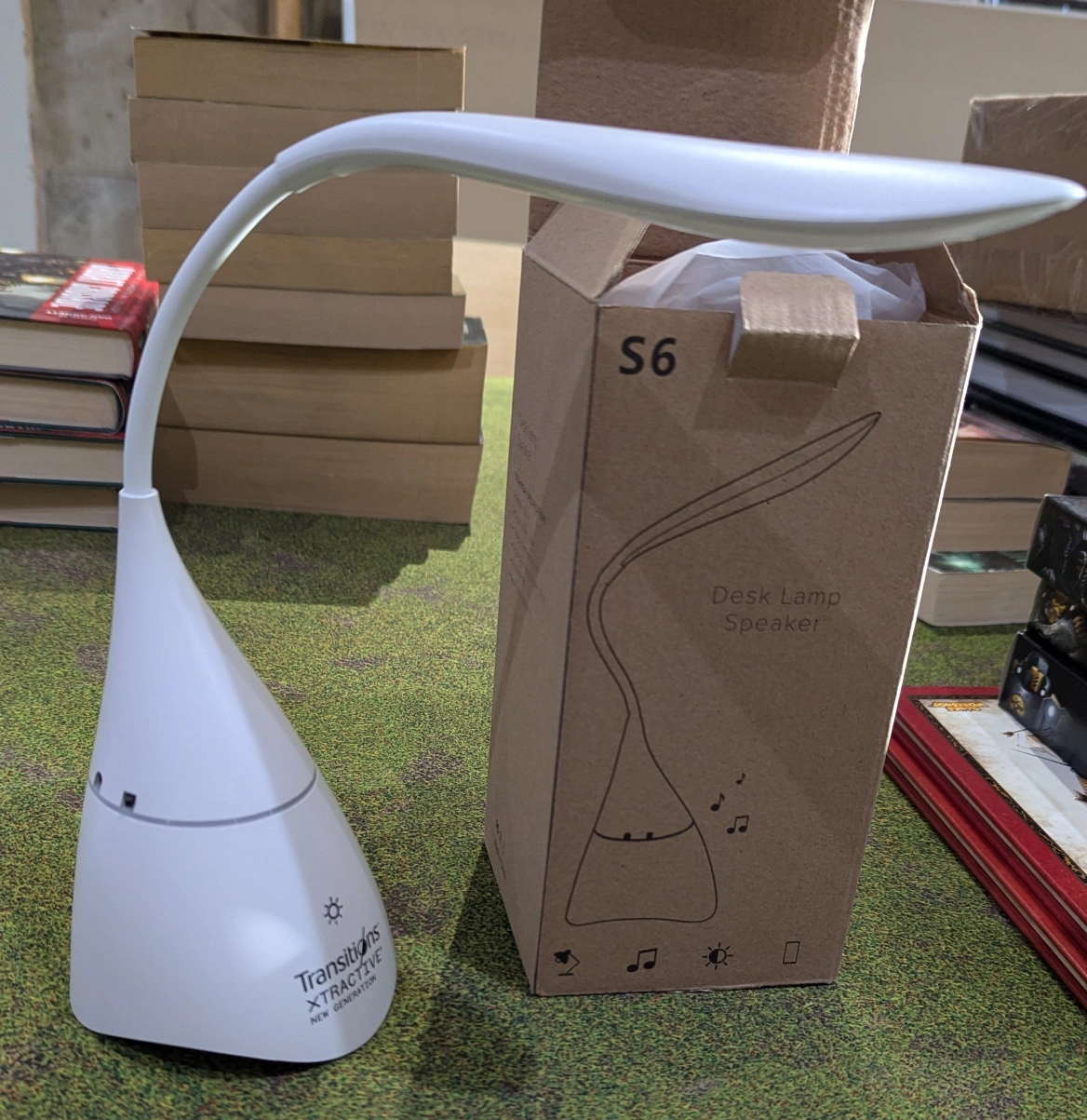 White desk lamp with built-in speaker. Flexible, gooseneck design. Comes in original packaging with USB plug.