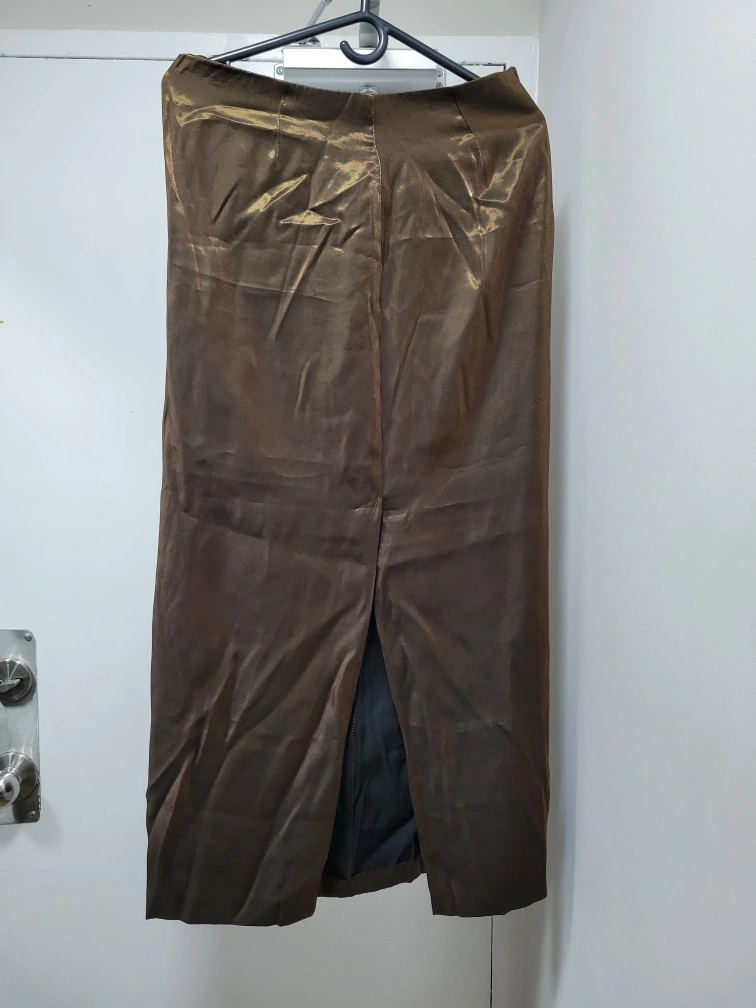 217Gorgeous bronze metallic maxi skirt. Size 11. Features a centre back slit. Elegant and stylish. Cash only Pick up only