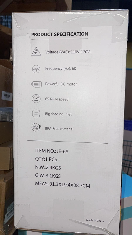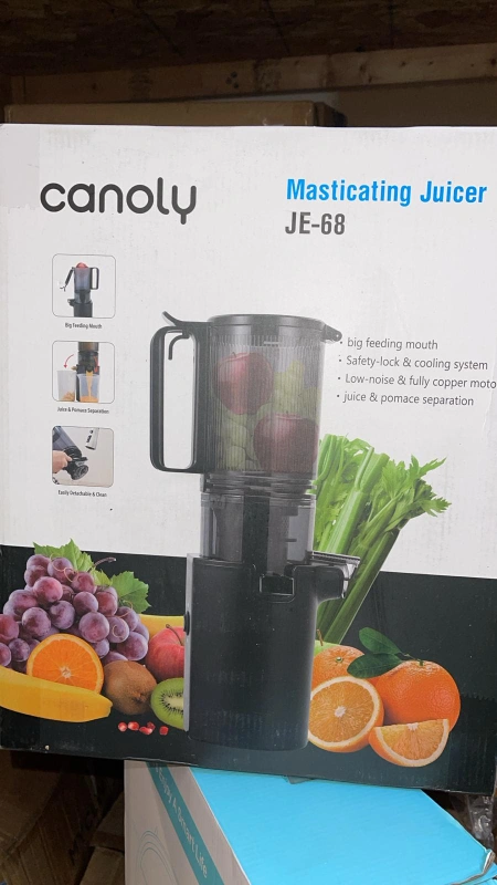 65Powerful masticating juicer. Brand new, never used. Features a big feeding mouth, safety-lock & cooling system, low-noise motor, and juice & pomace separation. BPA-free material. 65 RPM speed. 110V-120V, 60Hz.