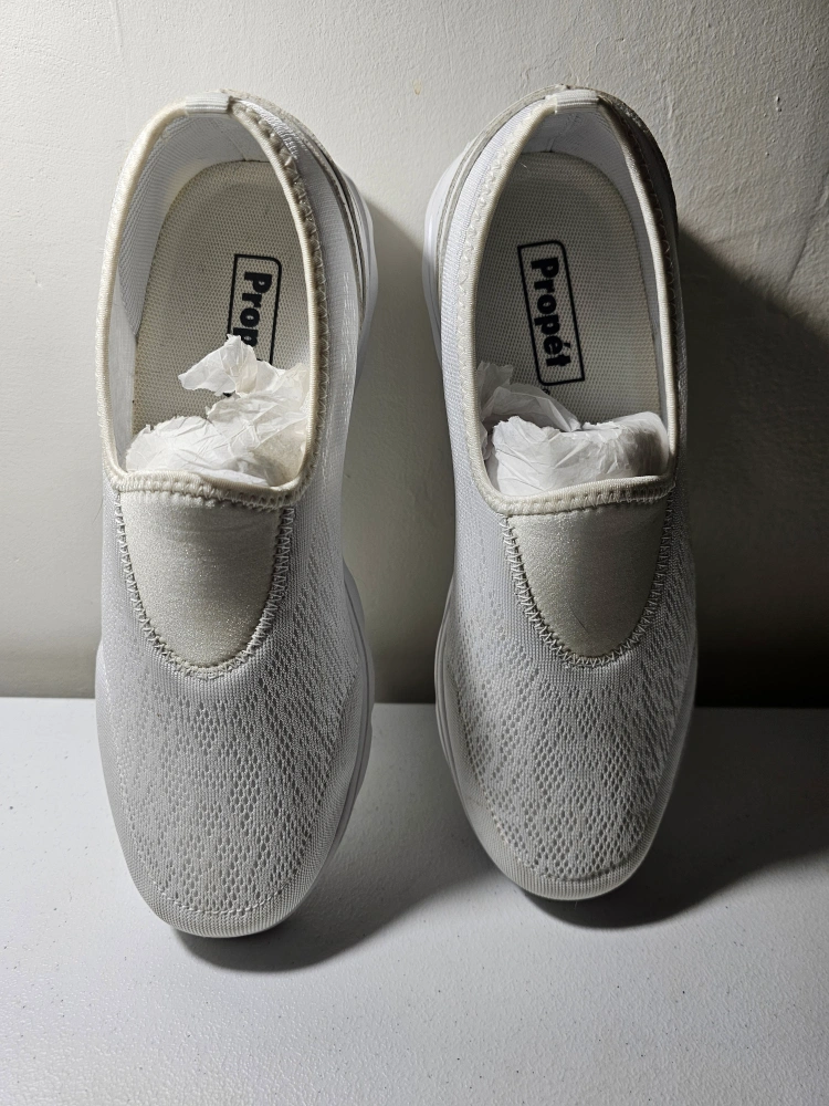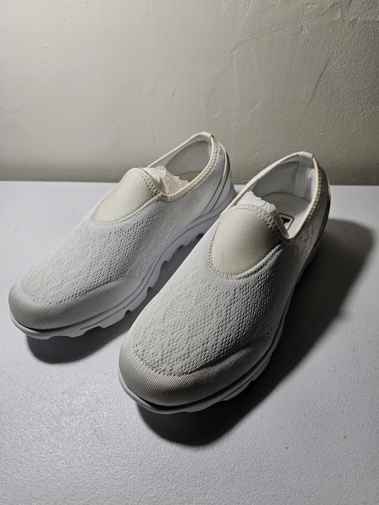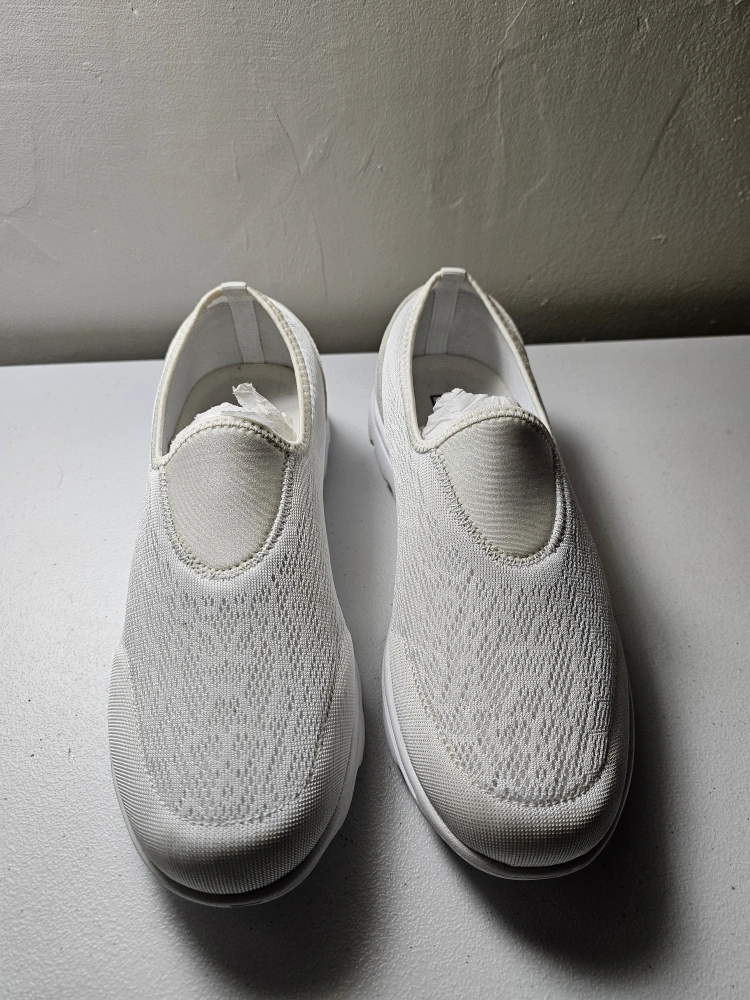 Women's white slip-on walking shoes. Comfortable and breathable mesh upper. Lightweight design. Great for everyday wear.