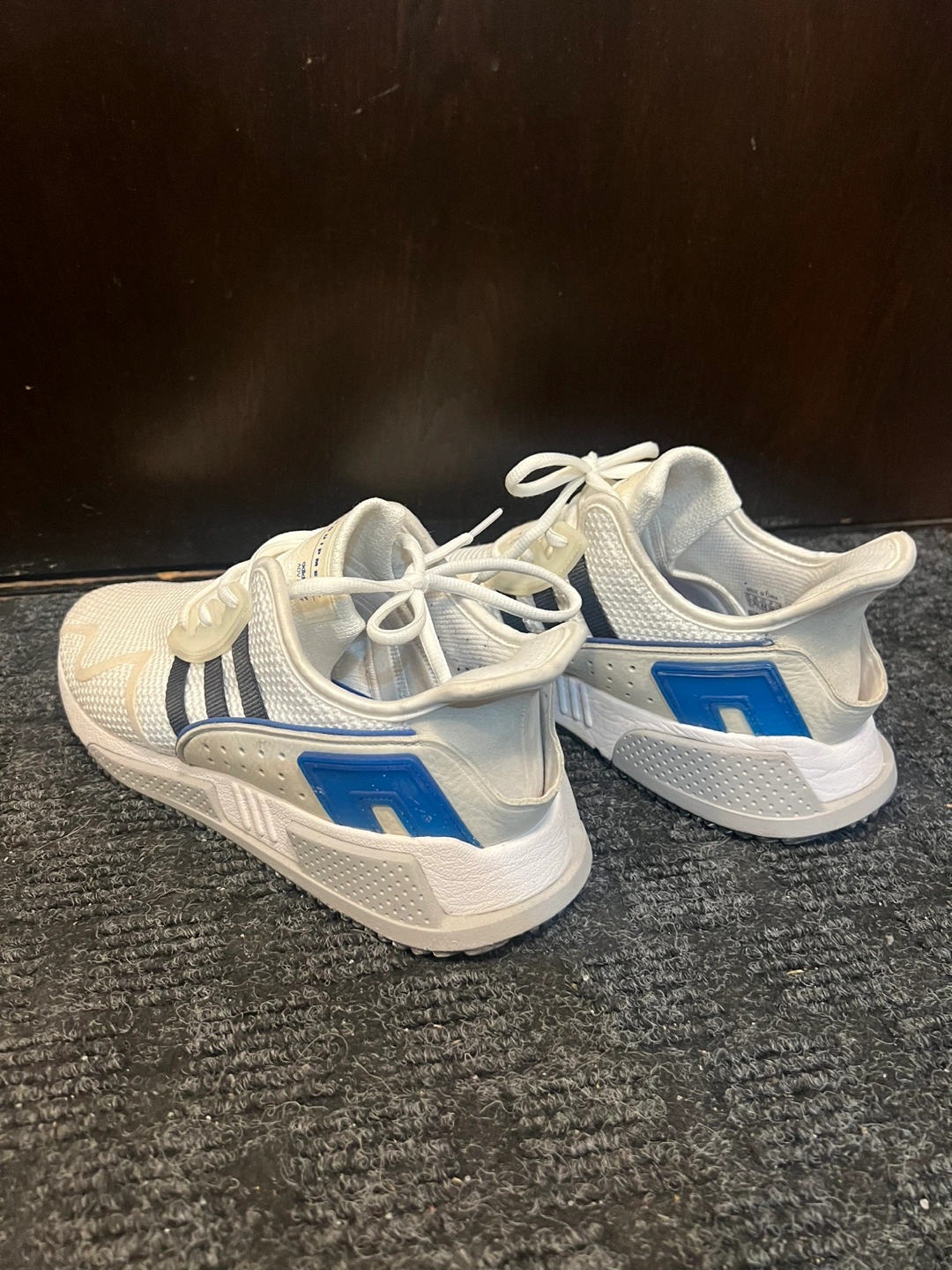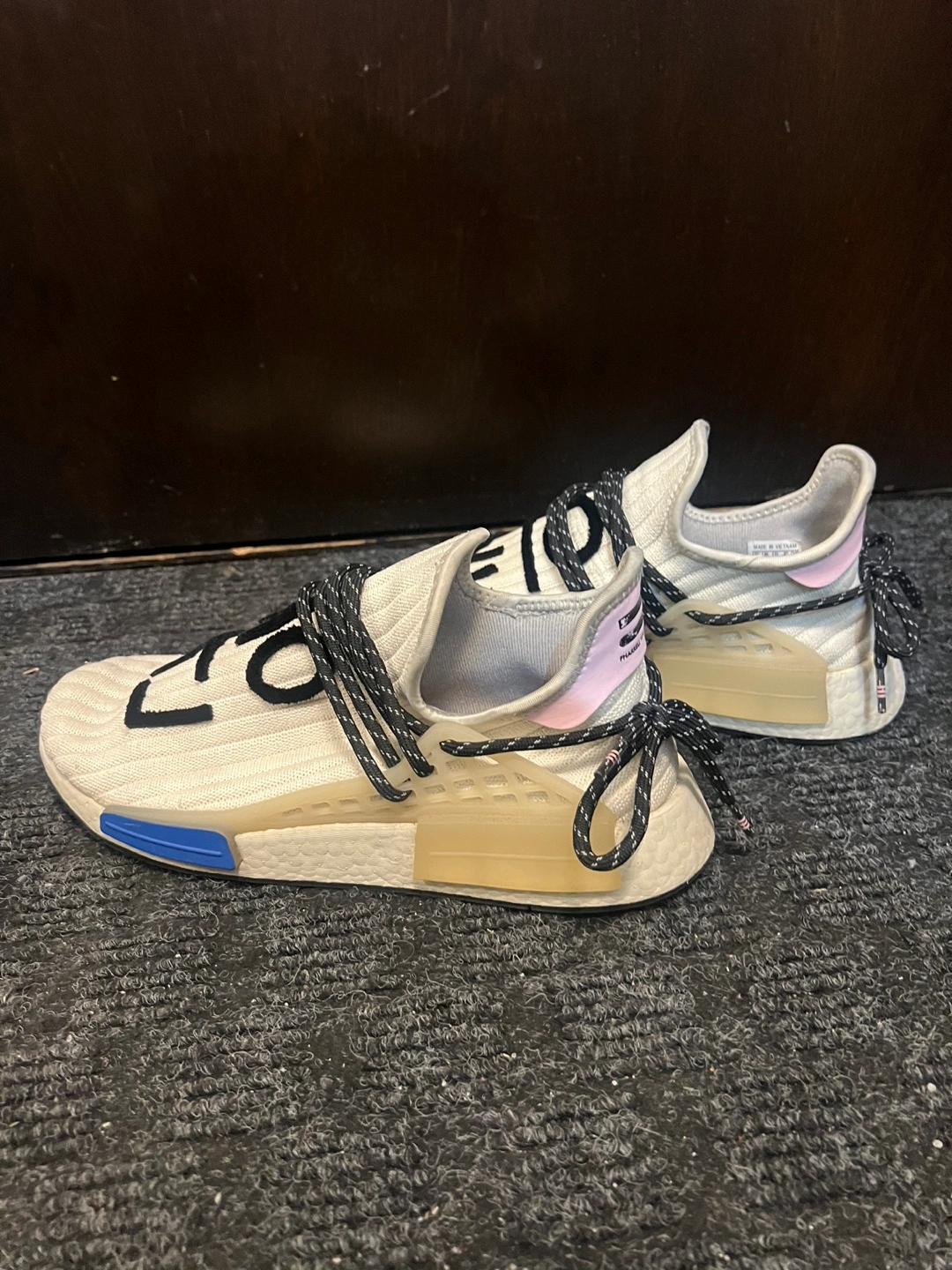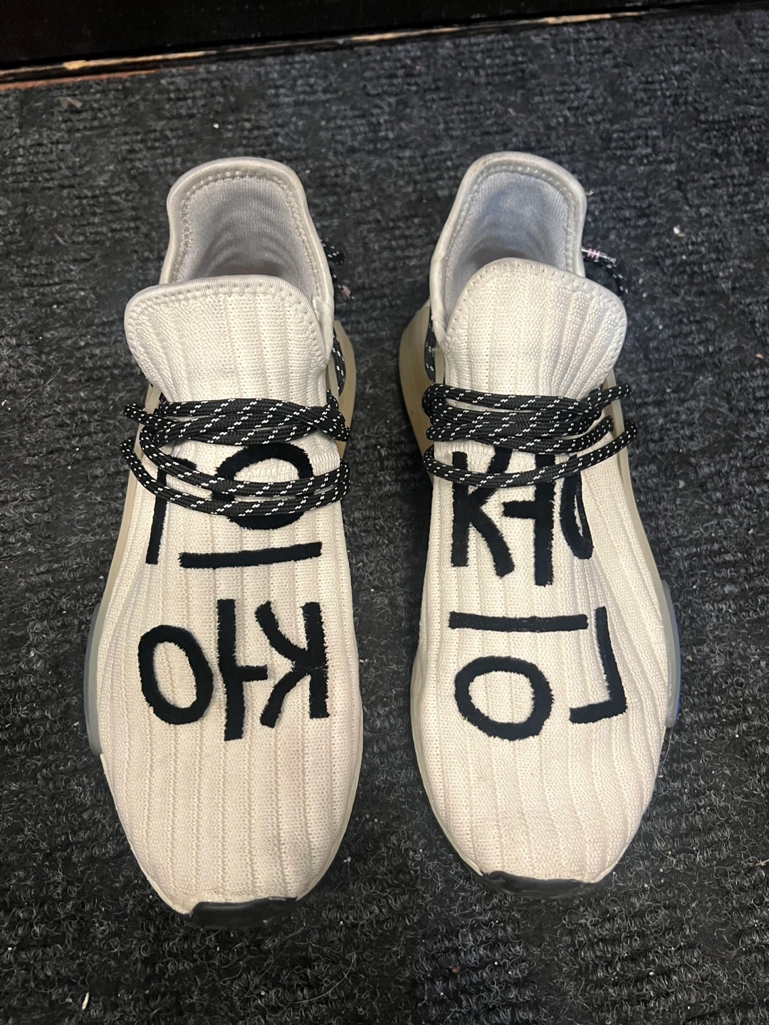 Adidas Hu NMD sneakers. Off-white knit upper. Black Korean characters. Blue and off-white sole. Unique design. Pre-owned.