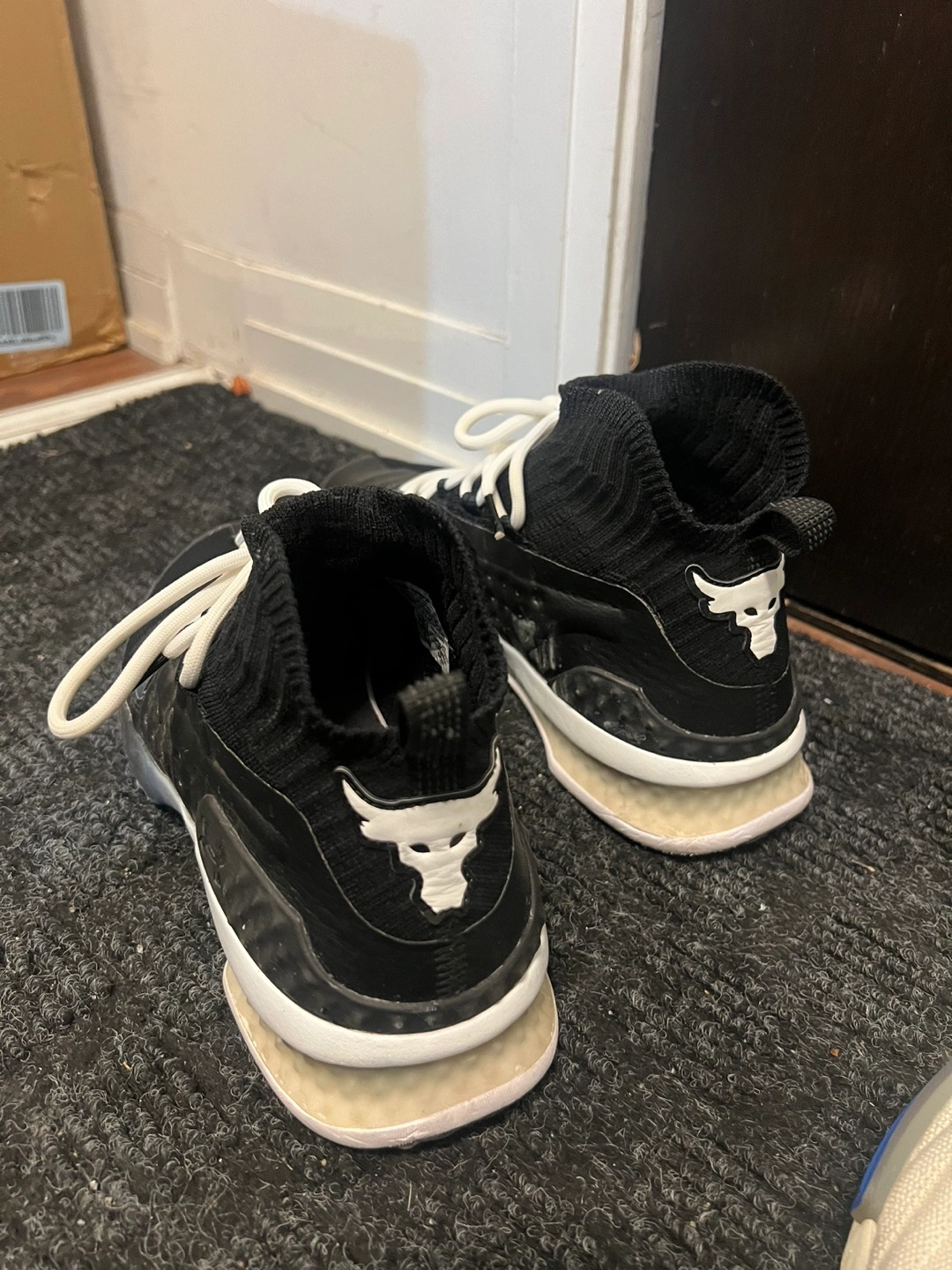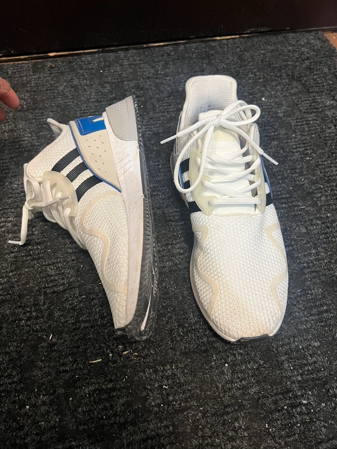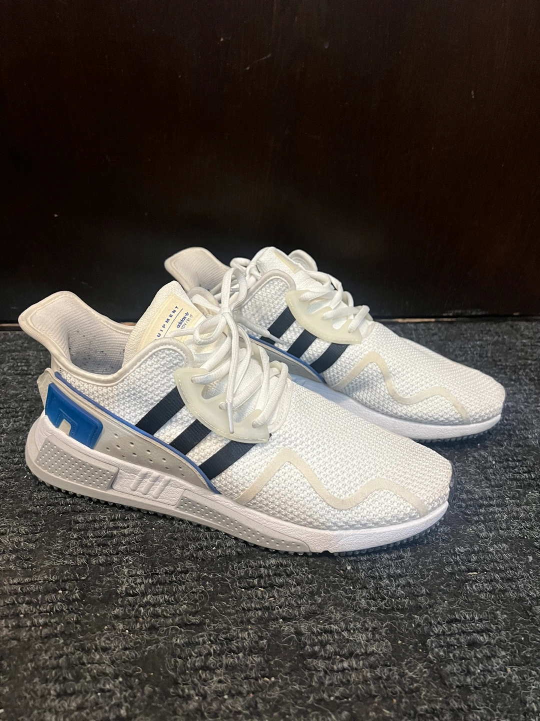Adidas Hu NMD sneakers. Off-white knit upper. Black Korean characters. Blue and off-white sole. Unique design. Pre-owned.