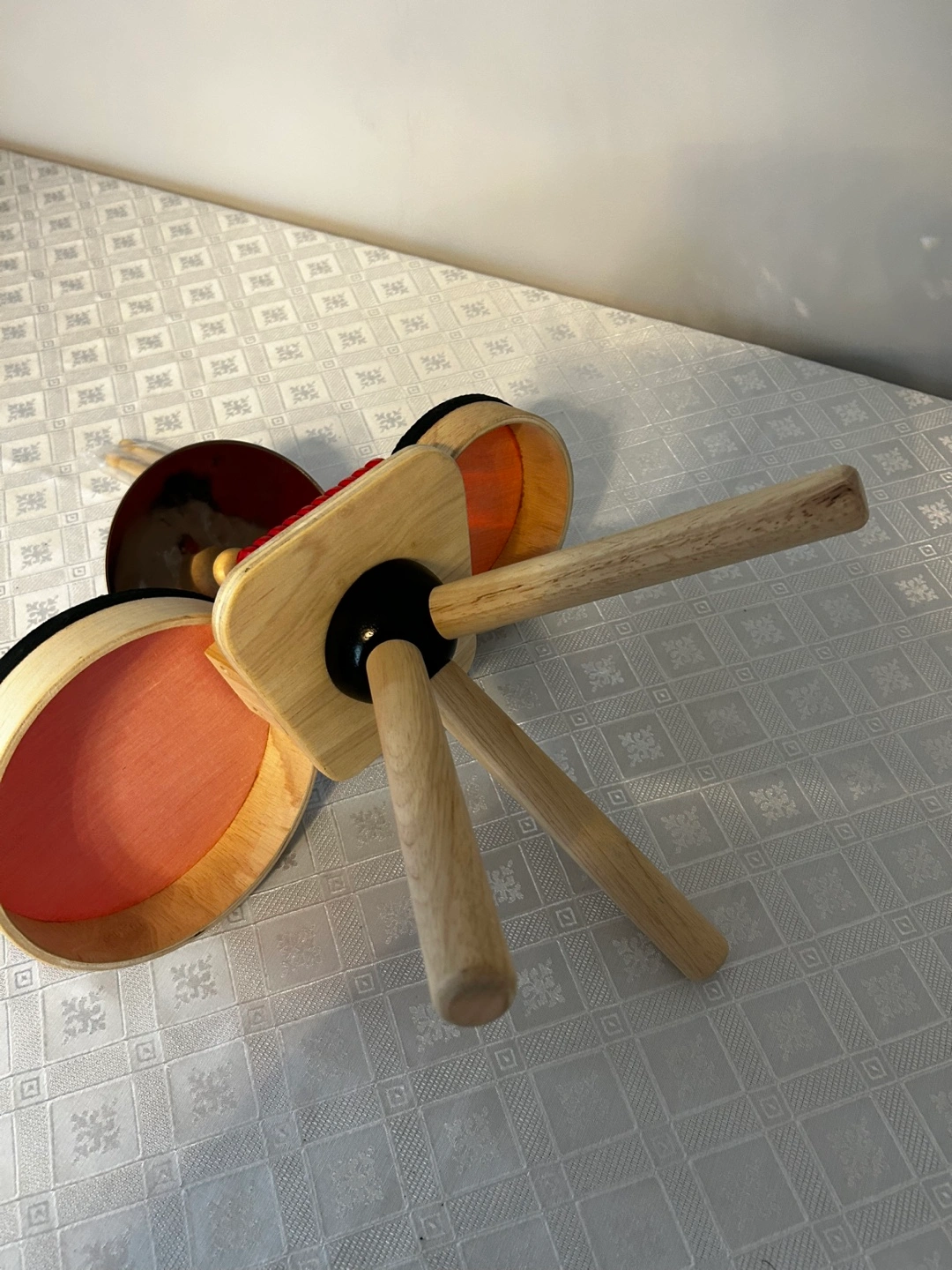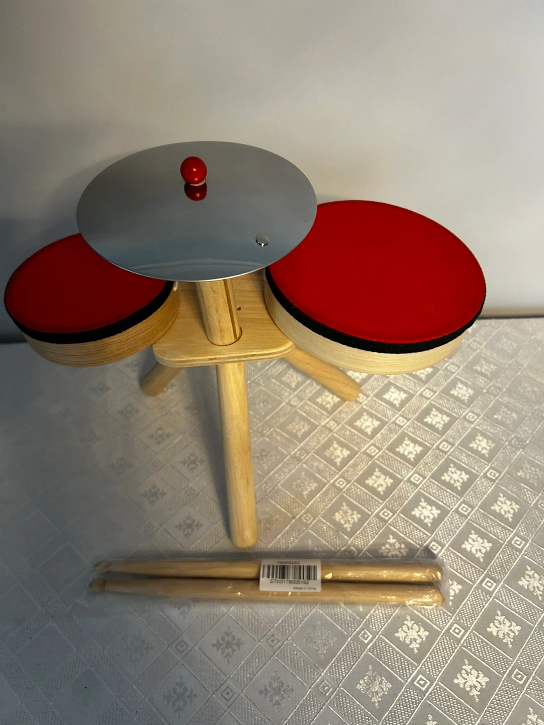 Adorable wooden toy drum set. Features two drums, cymbal, and drumsticks. Red and natural wood colours. Great for toddlers.