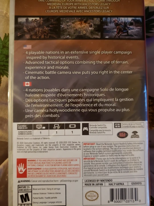 Nintendo Switch game. Action strategy game. Single player campaign. Four playable nations. Mature 17+ rating.