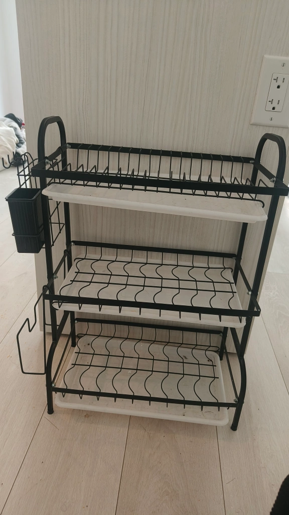 Three-tier dish drying rack. Black metal frame. White plastic trays. Utensil holder and side towel rack. Great for small kitchens.