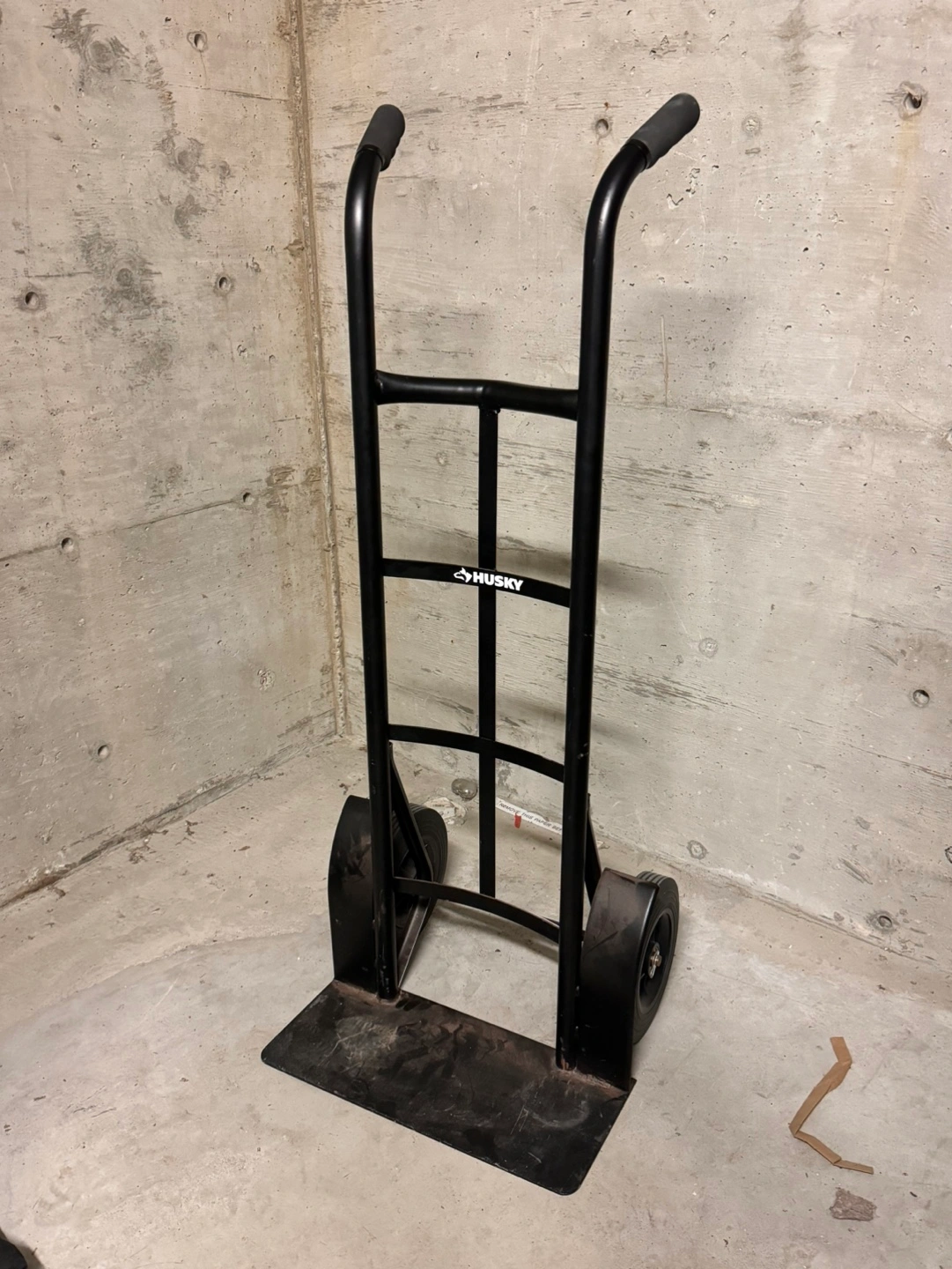 Black hand truck, sturdy construction. Durable metal frame. Pneumatic wheels. Good for moving heavy items.