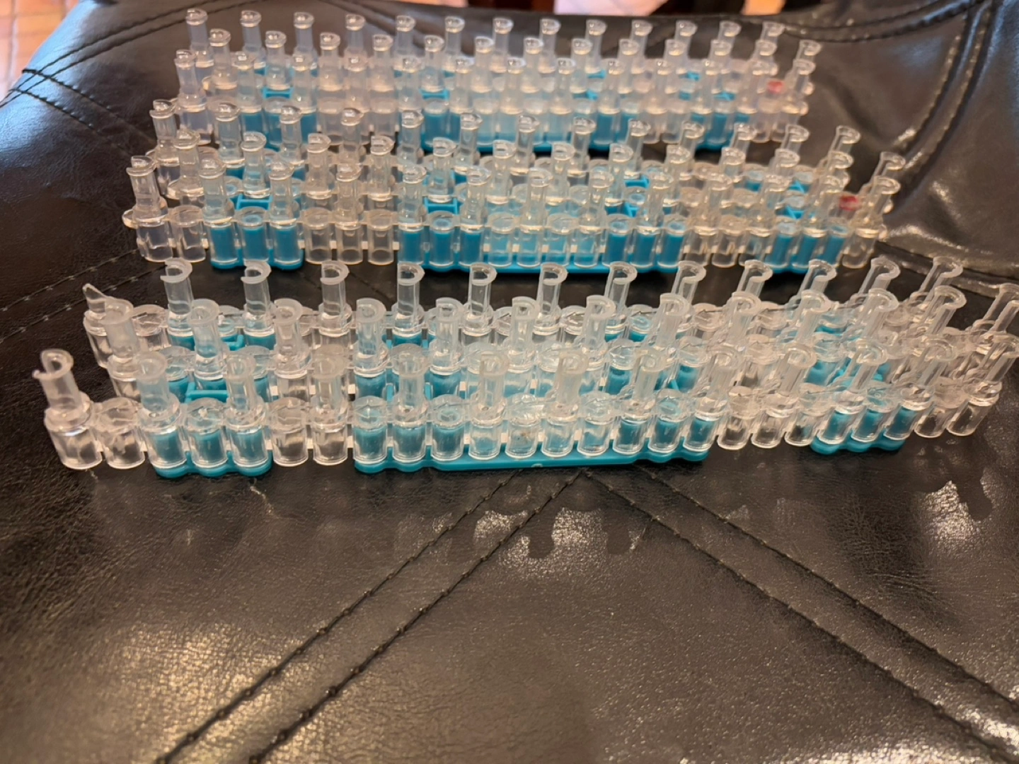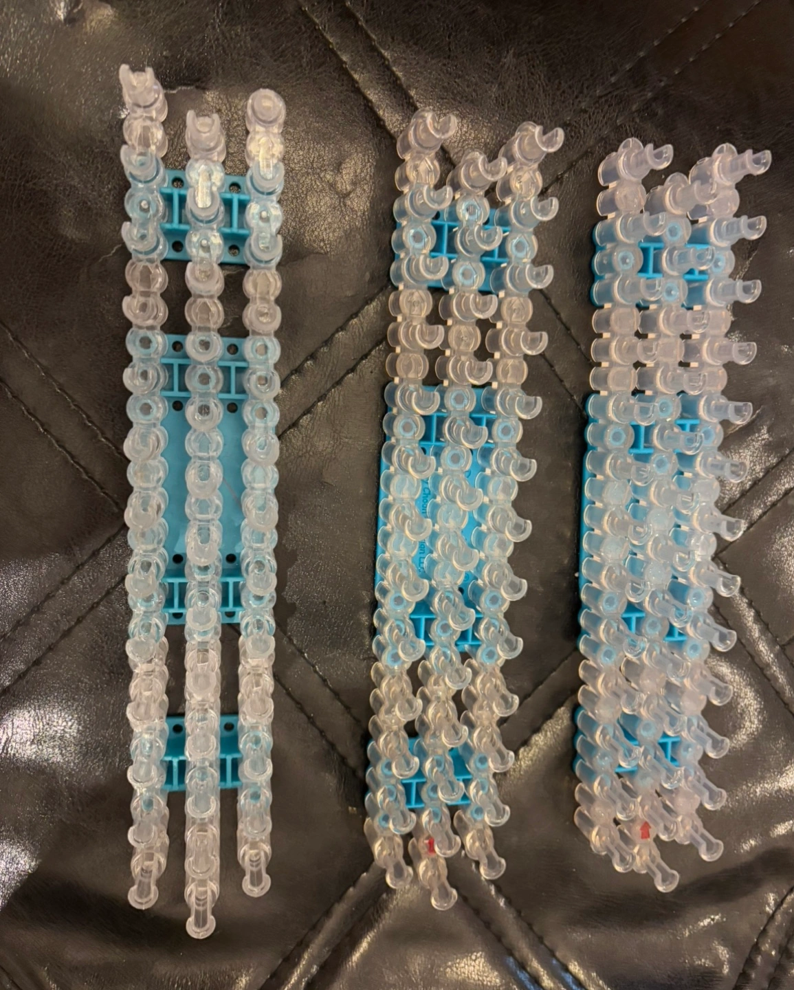 Three clear plastic Rainbow Loom bands. Blue plastic base. Great for making bracelets and other crafts. Used condition.