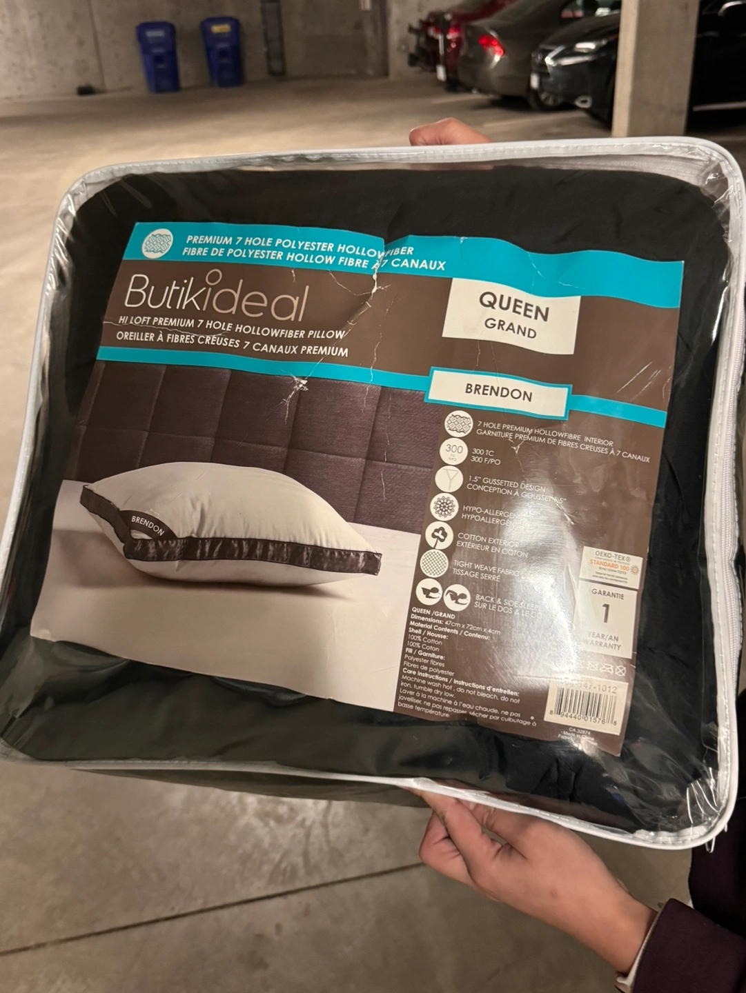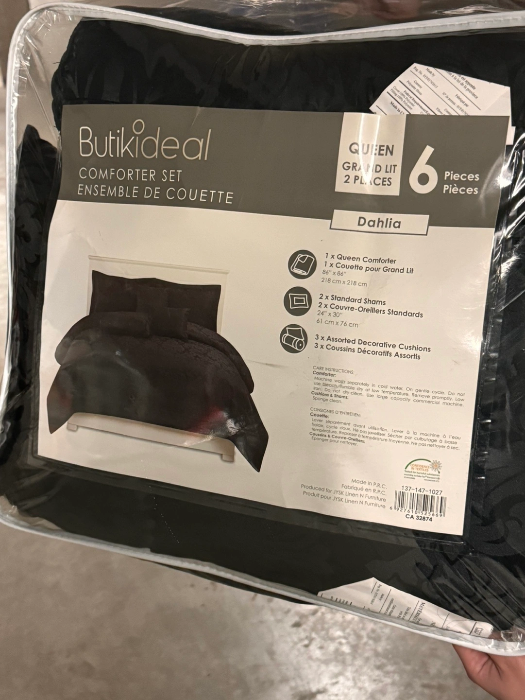 6-piece queen comforter set, Dahlia pattern. Includes comforter, two shams, and decorative cushions. Also, one Brendon brand pillow, queen size. Beige quilted blanket and red/green plaid blanket included.