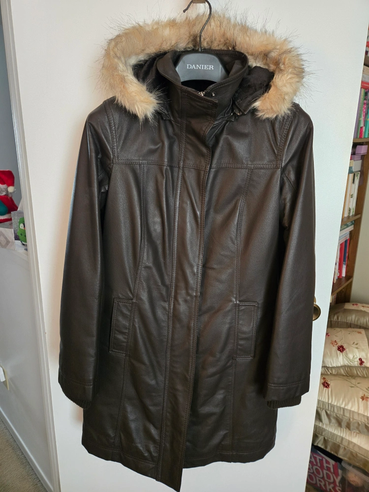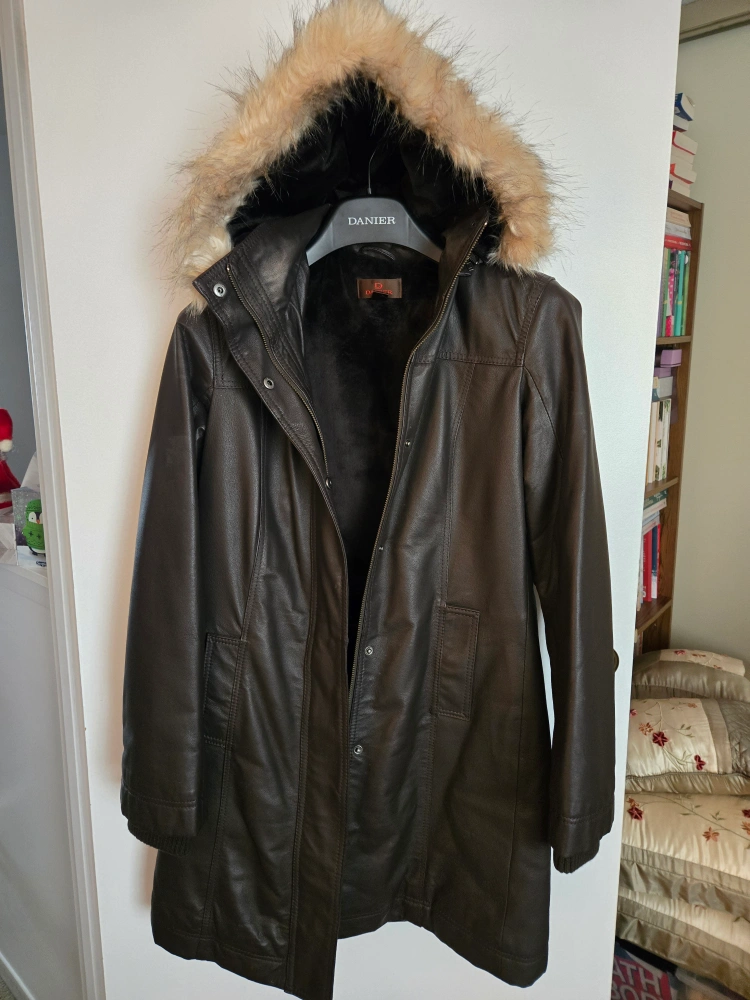 Gorgeous just above the knee brown leather winter coat. Features a detachable faux fur trimmed hood and warm lining. Long sleeves with ribbed cuffs. Multiple pockets. Excellent condition. Size S.