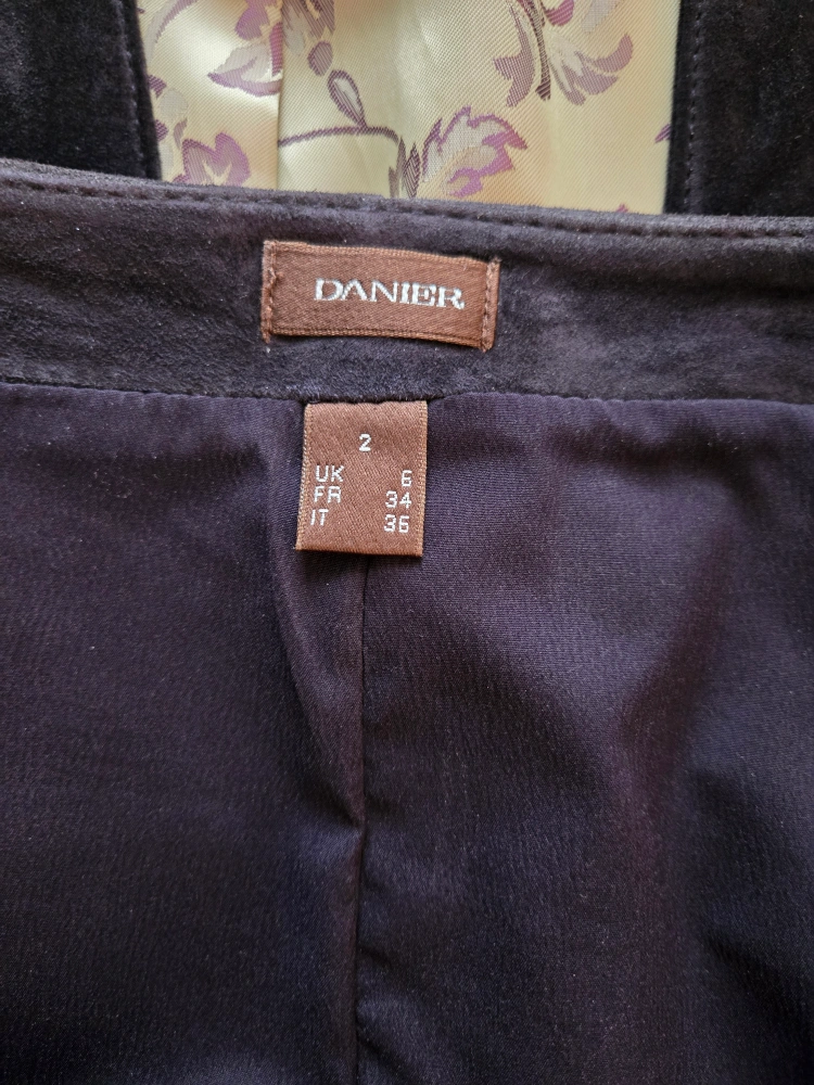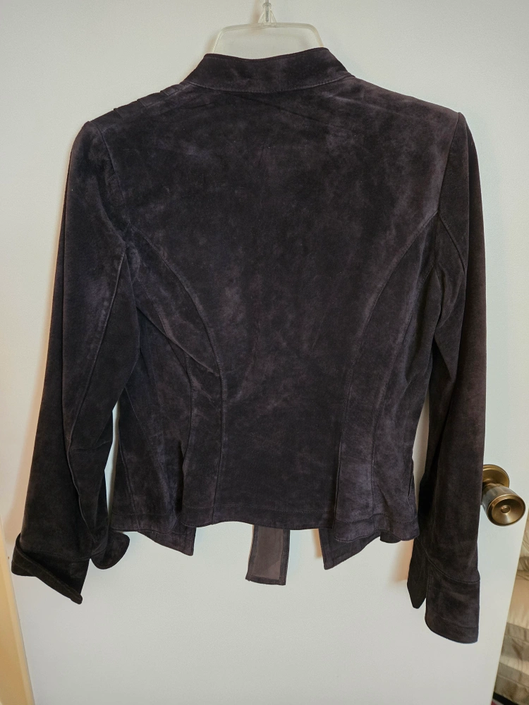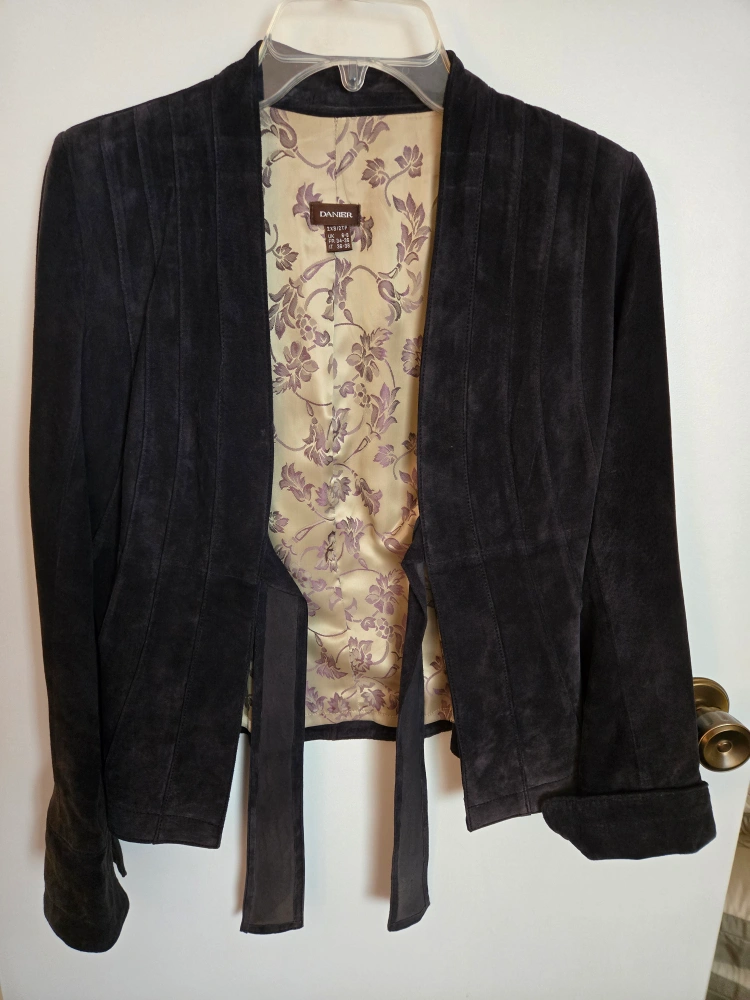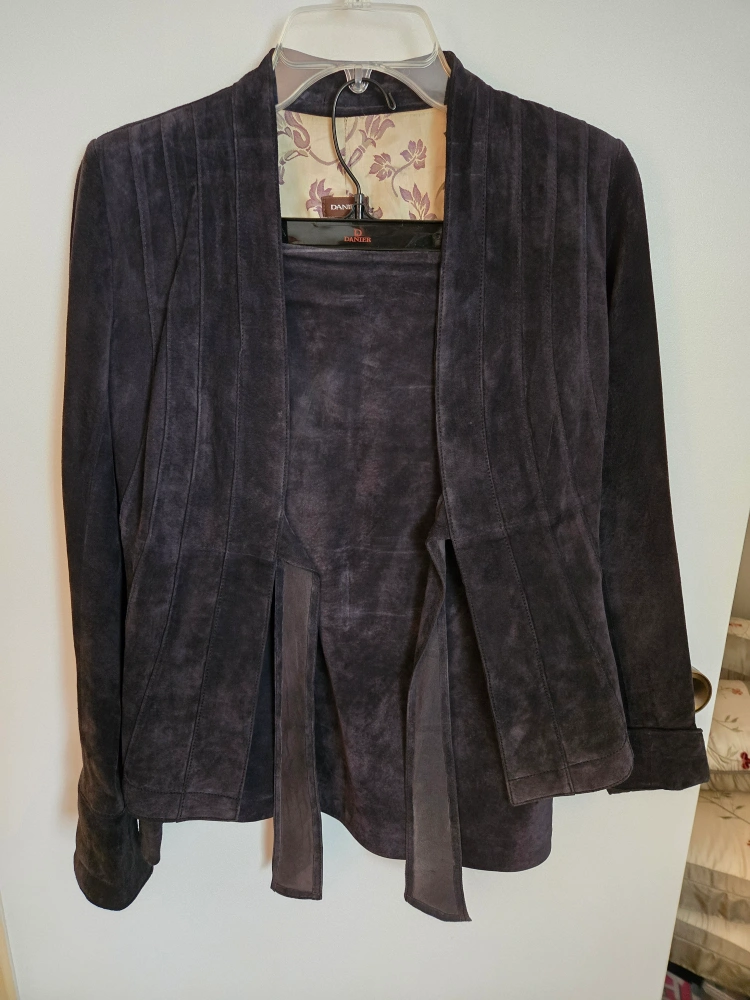 Purple suede jacket and pencil skirt suit. Long sleeves. Open front with self-tie. Lined with a floral patterned fabric. Jacket size 2XS, skirt size 2. Excellent condition.