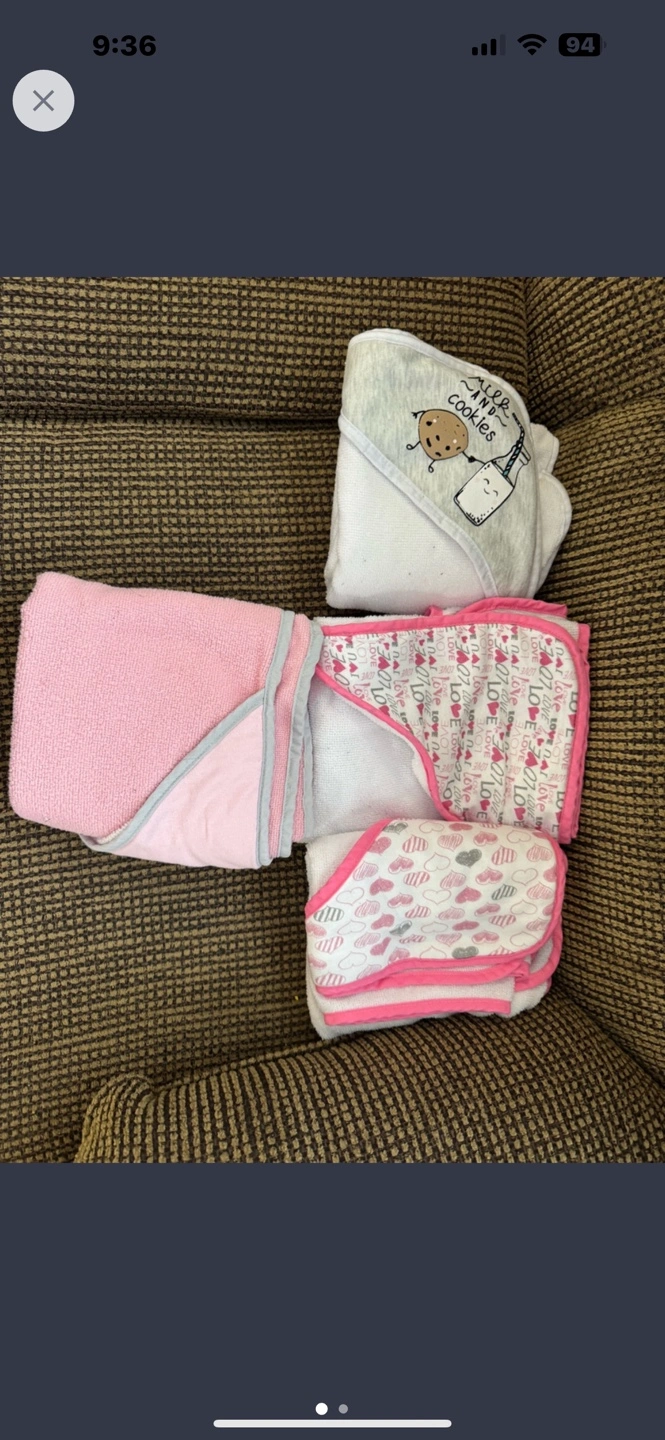 834 hooded baby towels. Pink, white with pink hearts, and grey with milk and cookies design. Soft and absorbent. Perfect for bath time.