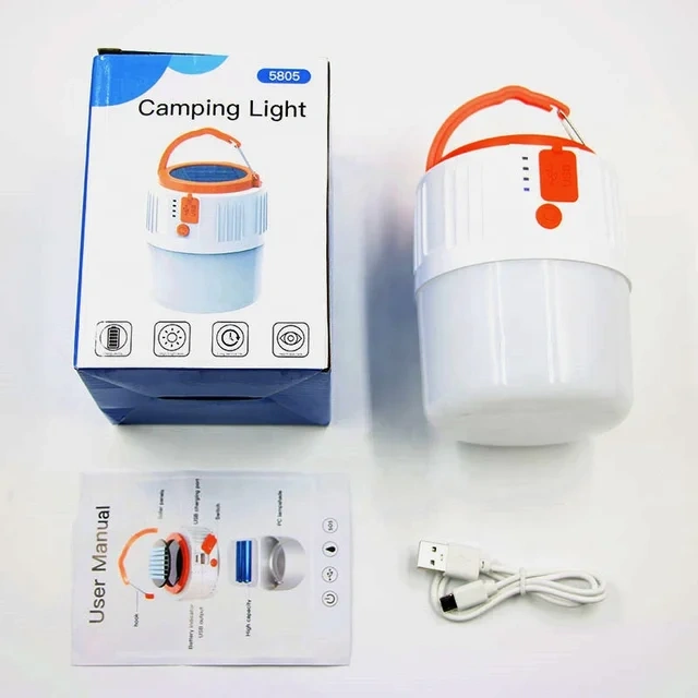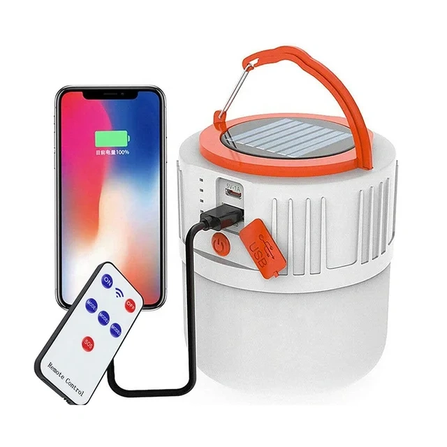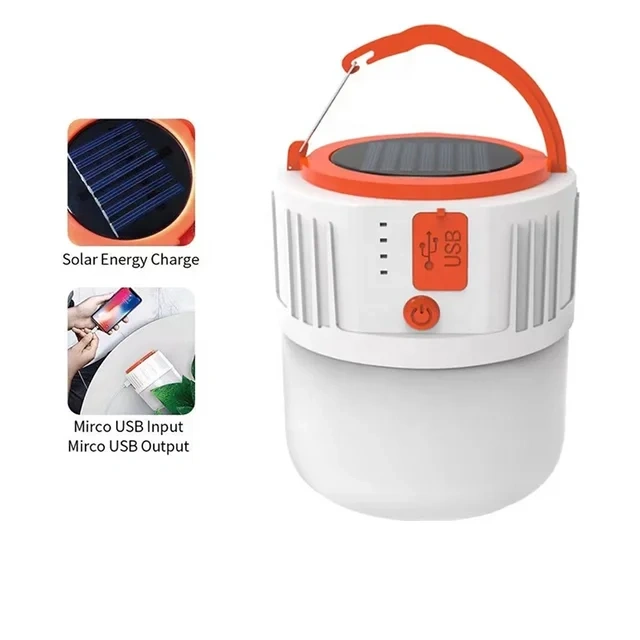 Solar powered camping light. Features USB charging and output. Energy saving, high brightness, long service life. Includes a carrying handle.