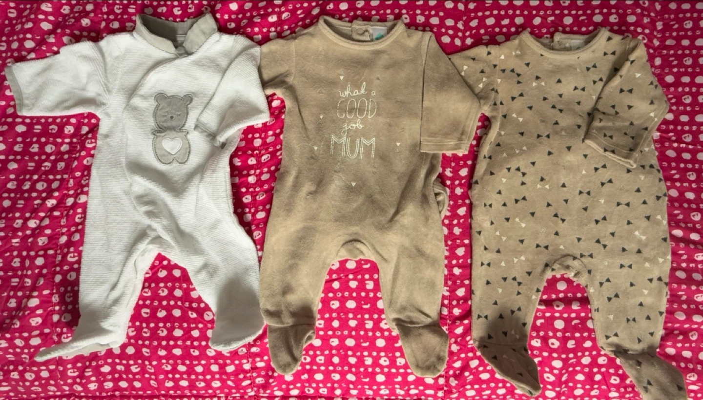 201Three adorable baby sleepsuits. Neutral colours. Soft material. Footed. Snap closures. Great for colder weather. Pre-loved, gently used. For Pick up MOP: Cash