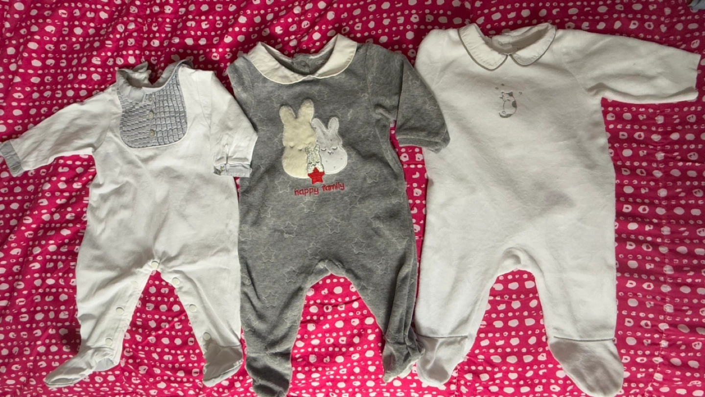 188Three adorable baby sleepsuits. Size 1 month. Two white, one grey. Soft material. Perfect for newborns. Pre-owned. For Pick up MOP: Cash