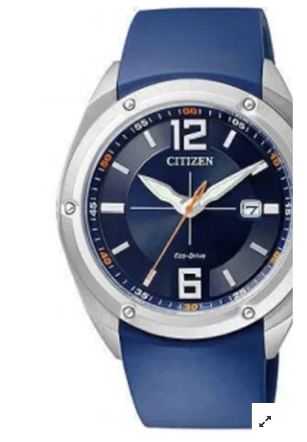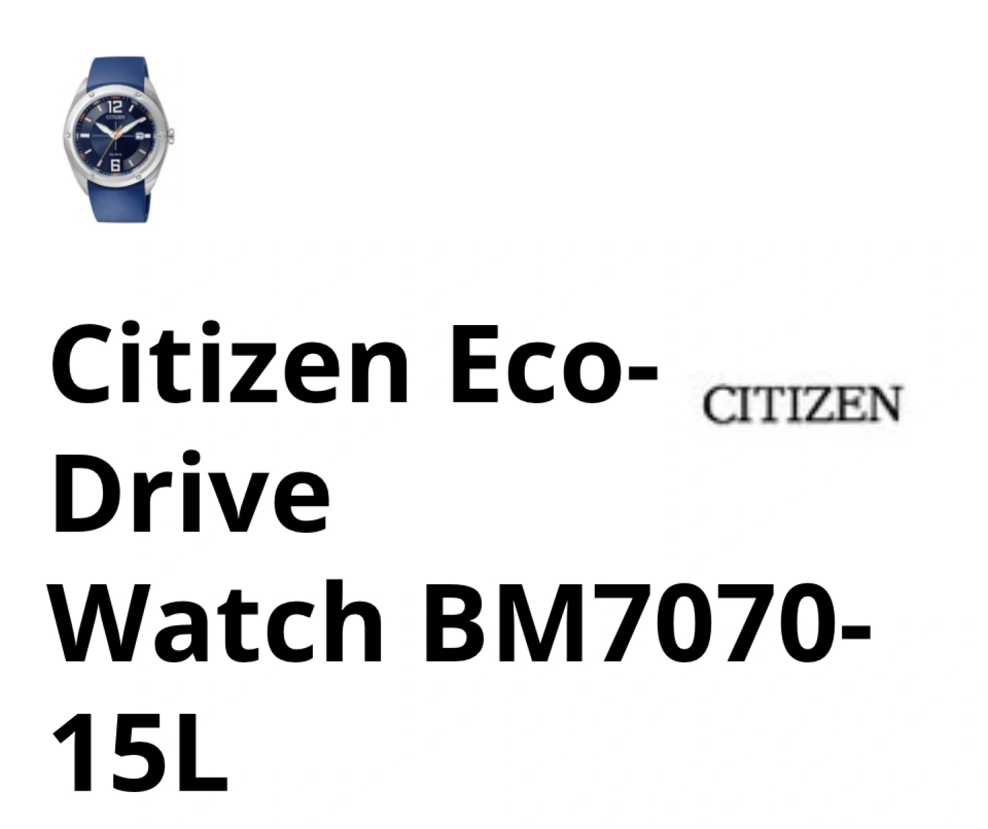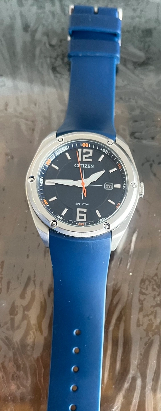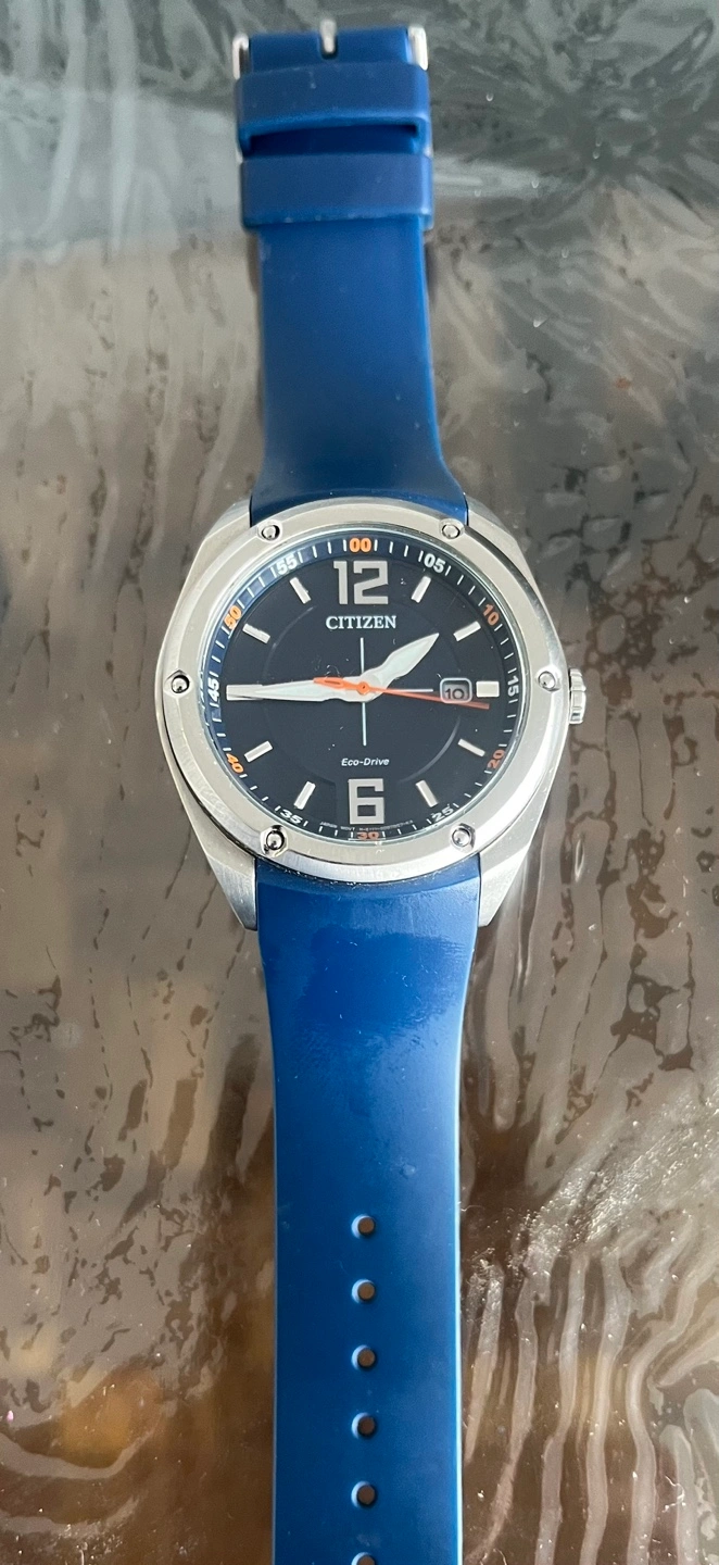 85Citizen Eco-Drive watch. Blue silicone band. Silver-tone case. Analogue display. Pre-owned.