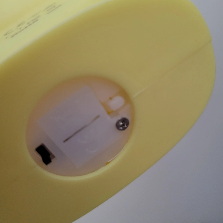 Yellow retro TV-shaped night light. Features a small We Bare Bears Grizz figurine. Battery operated.