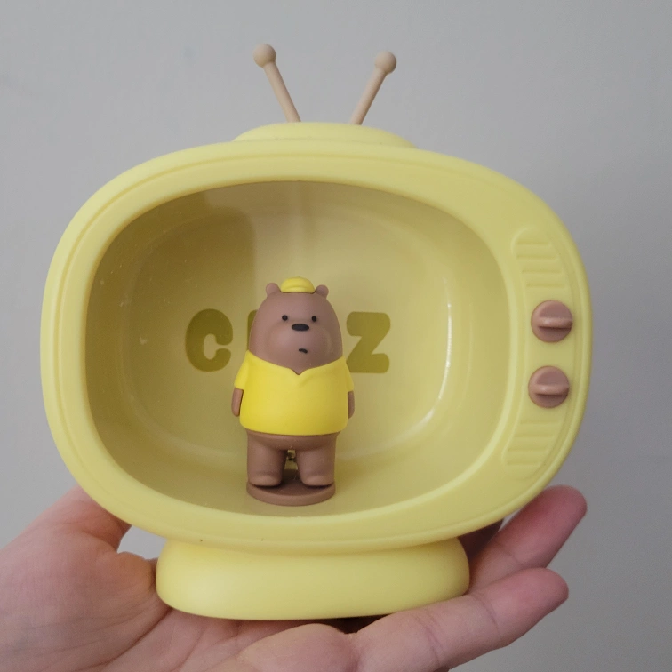 Yellow retro TV-shaped night light. Features a small We Bare Bears Grizz figurine. Battery operated.