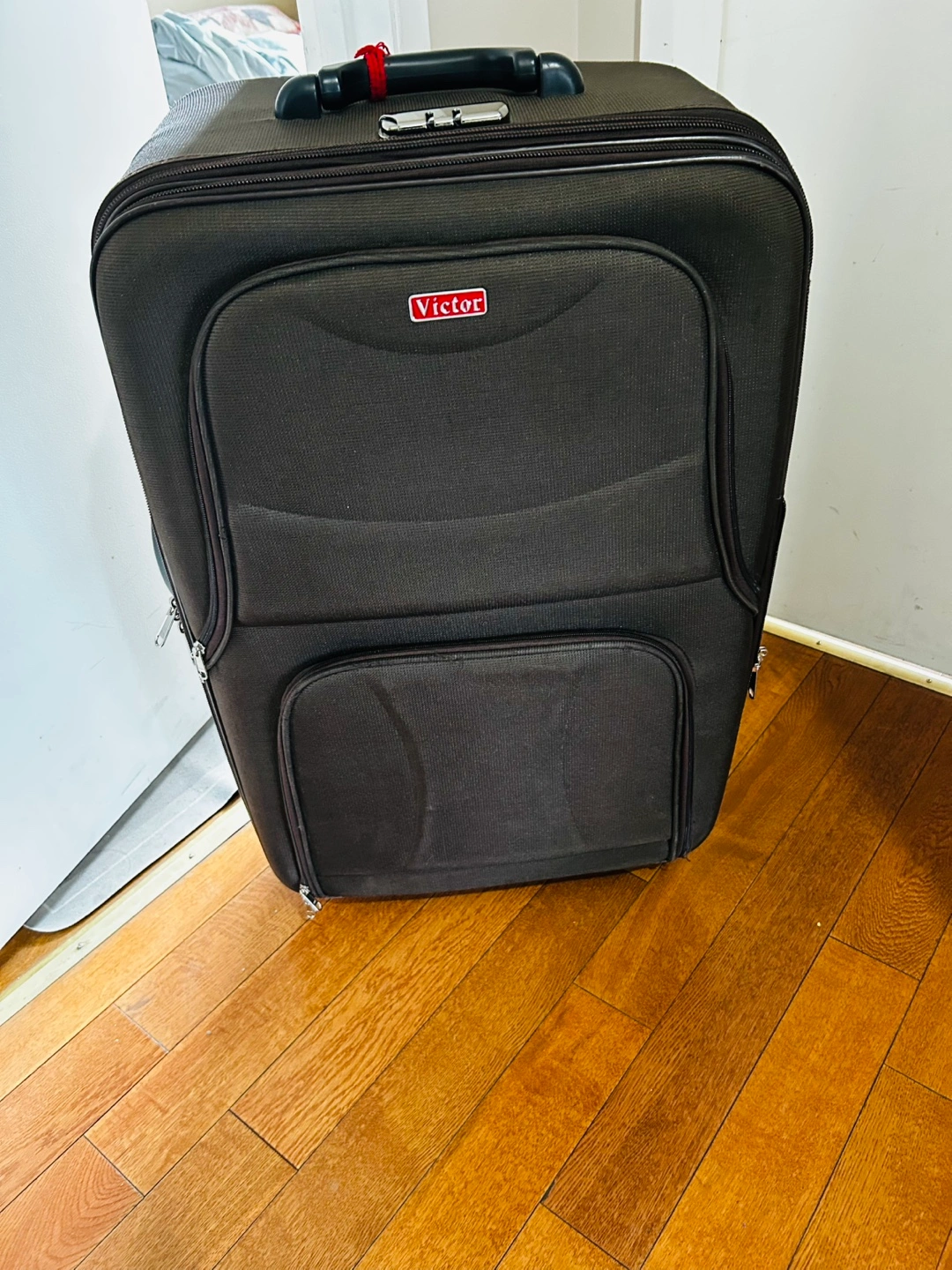 Dark brown luggage. Features a retractable handle and wheels. Multiple zippered compartments. Great for travel.
