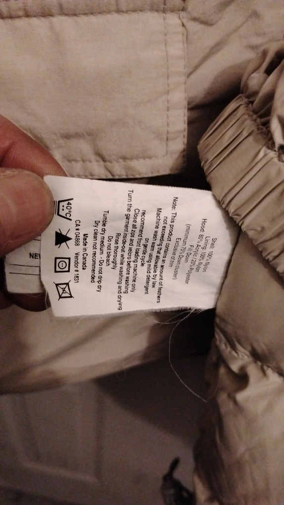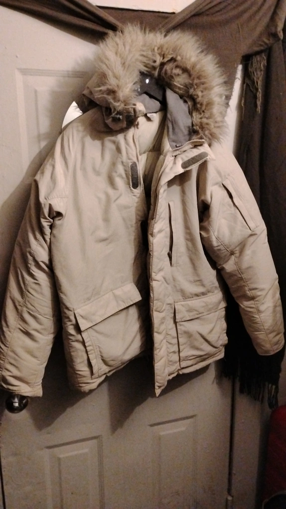 Men's size medium parka. Beige colour. Features a fur-trimmed hood. Made in Canada.