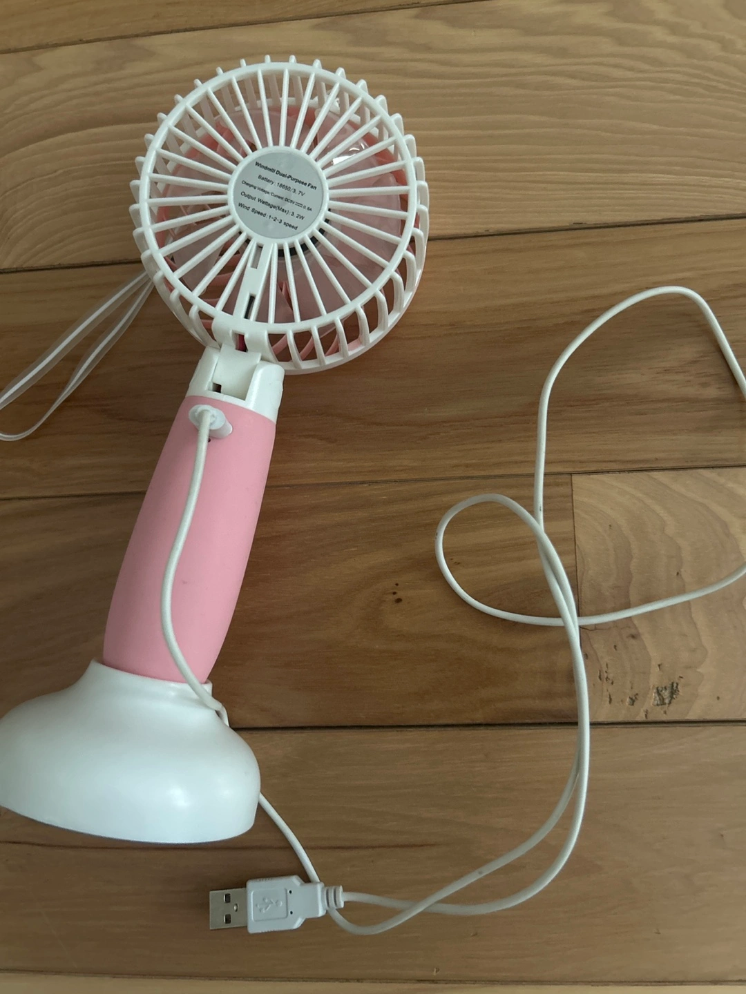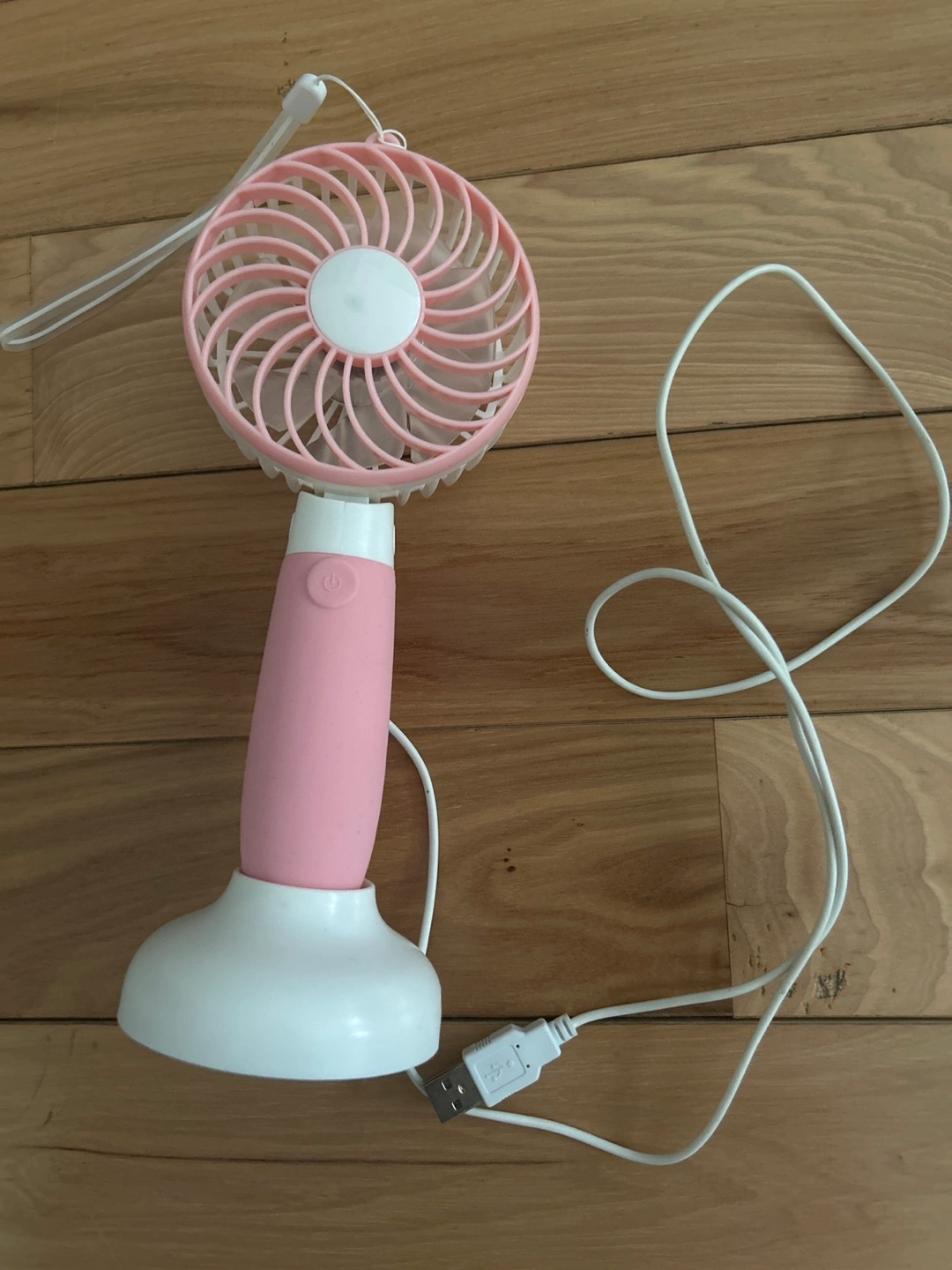 Portable desk fan. Pink and white color scheme. USB rechargeable. Includes a wrist strap. Compact size. Perfect for travel or home use. With out box