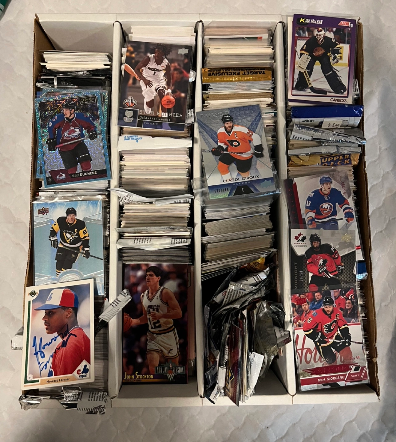 4 row box pretty much full of an arrangement of cards varying from hockey to basketball to baseball to football and more. Condition varies. Mostly vintage stuff from the late 80s to early 2000s but some modern stuff in there too! Some numbered cards, rookies, inserts!