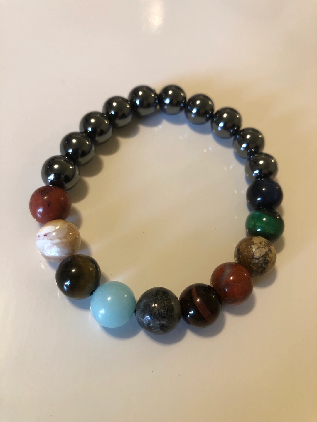 Stretch bracelet. Hematite beads surround colorful gemstone beads. Includes red jasper, carnelian, tiger eye, aquamarine, black tourmaline, lapis lazuli, and malachite.Handmade