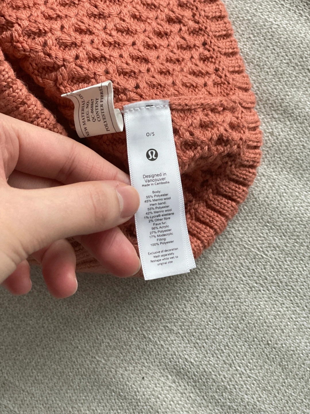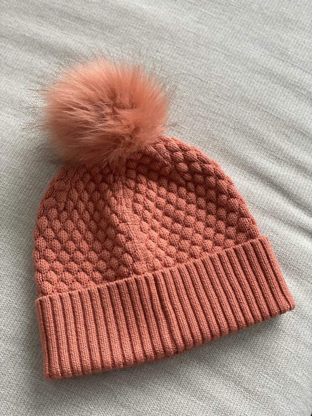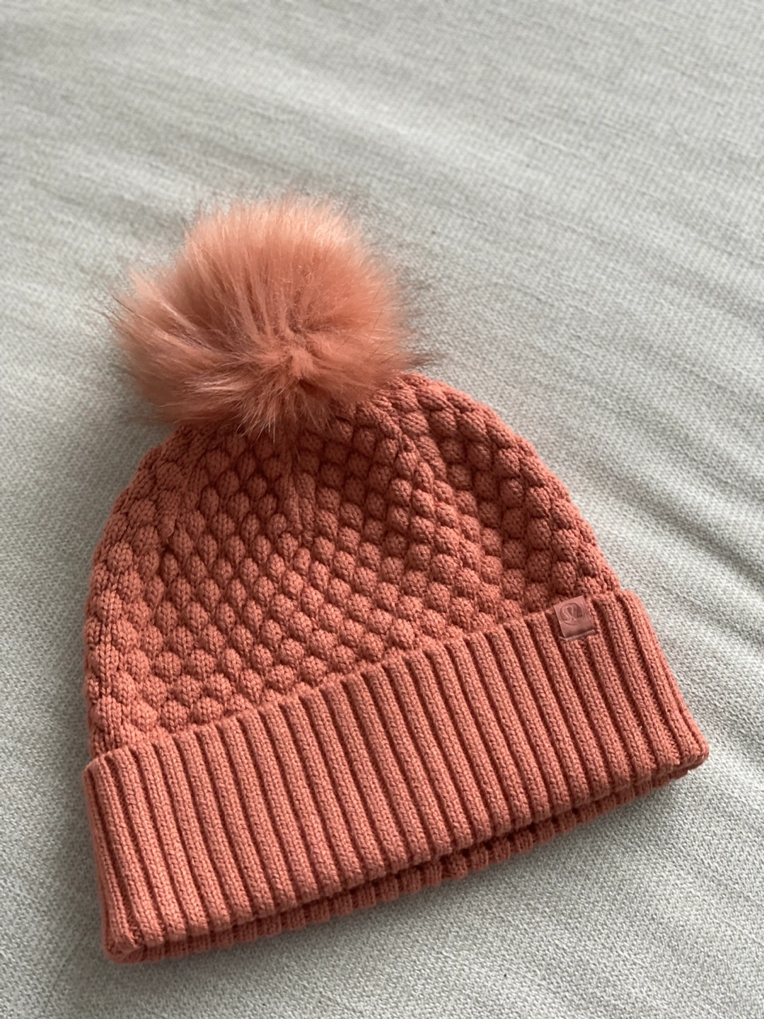 Muted orange coloured toque from Lululemon. Features a textured knit and a fluffy pom-pom. Size 0/S.