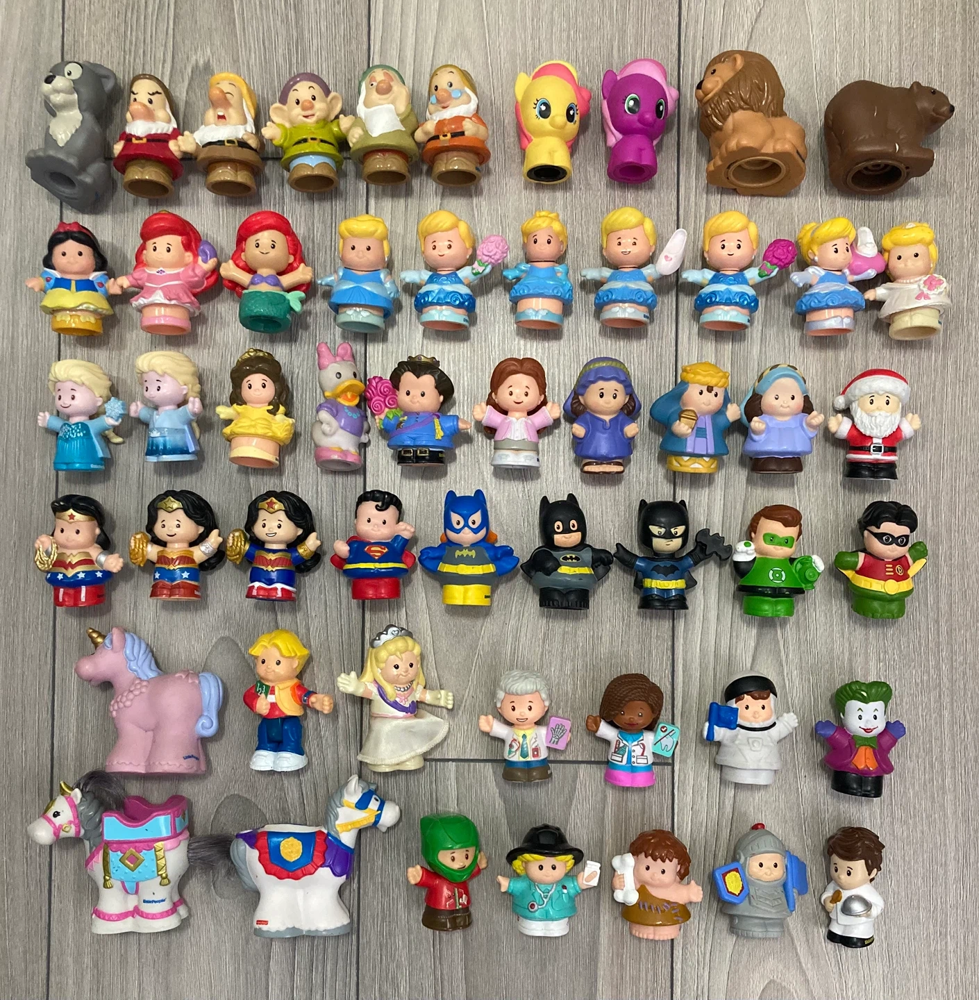 Assortment of figures and animals: different jobs (doctor, dentist, chef, astronaut) Christmas, caveman, cartoon characters (Disney Princess, Mickey Clubhouse, DC, Marvels), ponies/unicorns, bendable characters, animal zoo talkers (lion & bear) etc