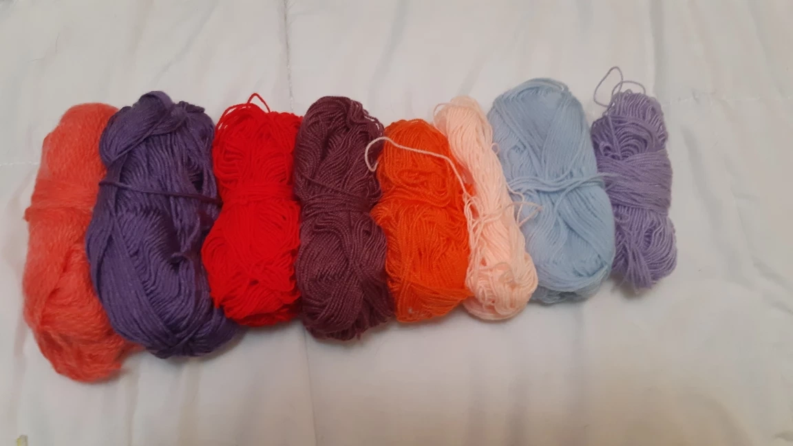 Seven balls of yarn. Various colours including purple, red, orange, pink, and light blue. Perfect for knitting or crocheting projects. my location near Southgate mall