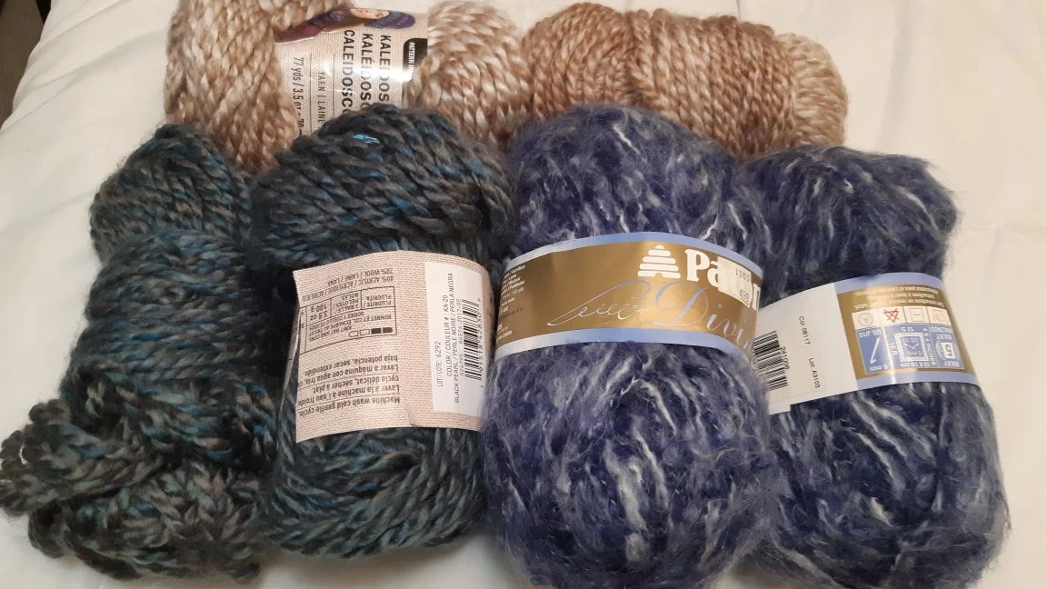 Five balls of yarn. Kaleidoscope brand and Patons Divina brand. Various colours and weights. Perfect for knitting or crocheting projects. price is for all. my location near Southgate mall