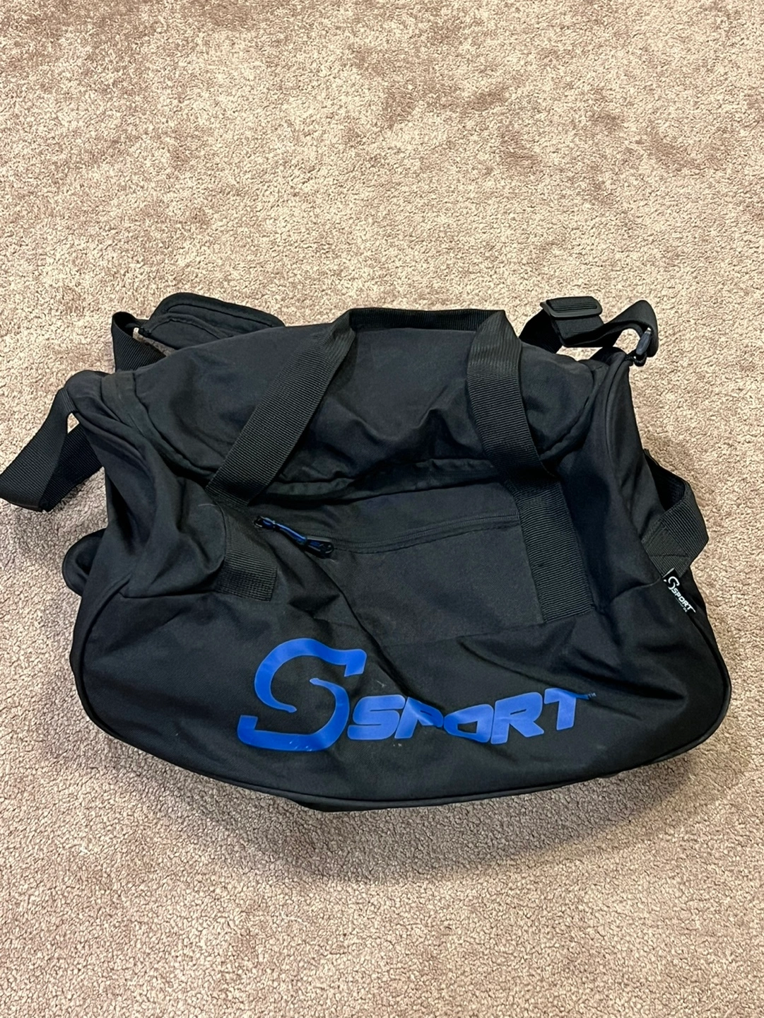 Black duffel bag. Features a main compartment and smaller zippered pocket. Shoulder strap included. SSport branding.