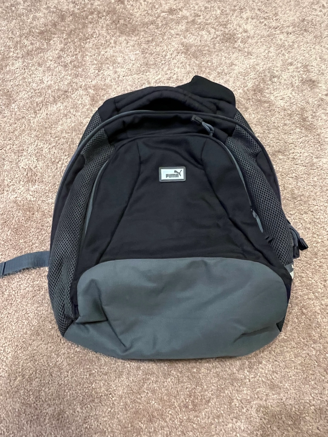 Black and grey Puma backpack. Multiple compartments. Mesh side pockets. Great for school or travel.