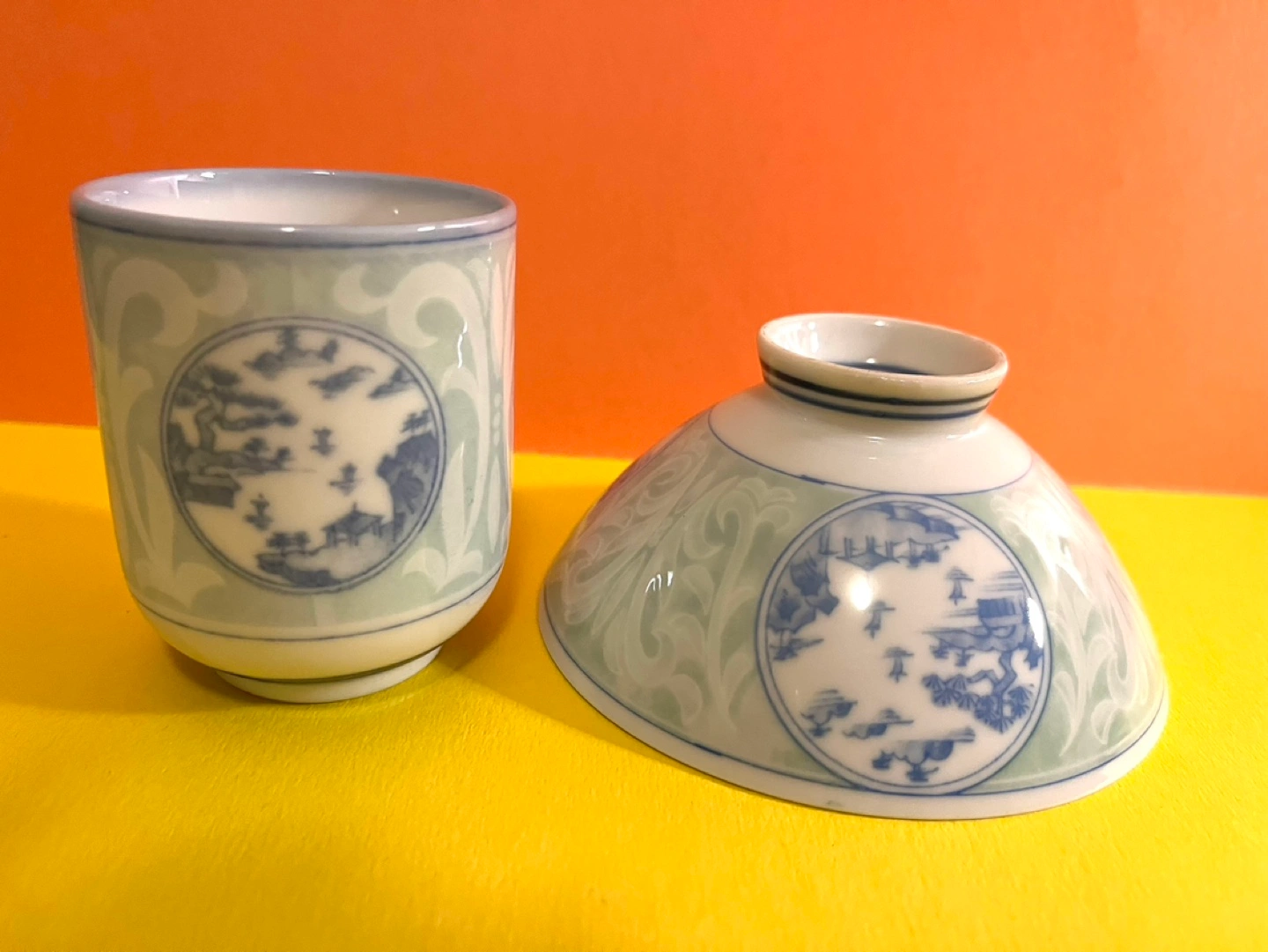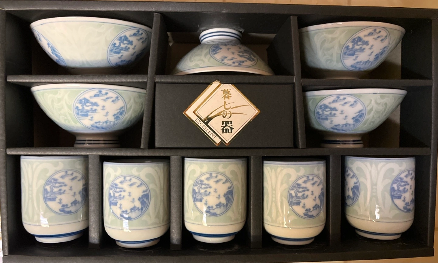 New Japanese style porcelain tea and bowl set. Includes five cups and five bowls. In original presentation box.