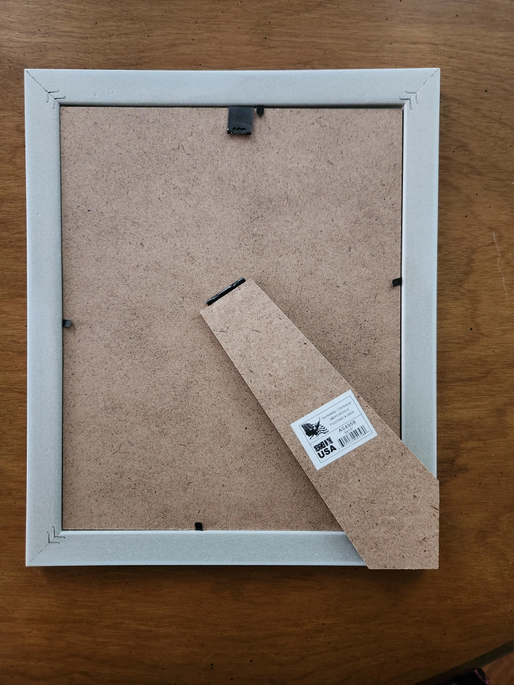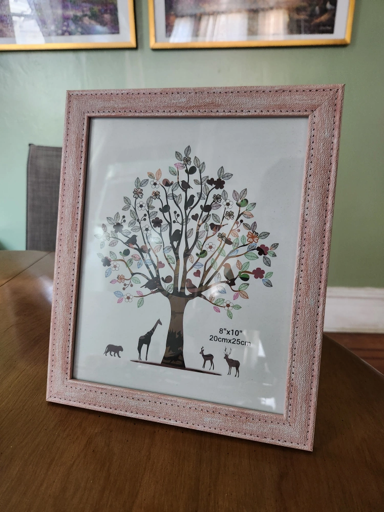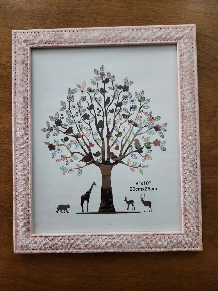 195Pink wooden picture frame. Measures 8x10 inches. Features a printed image of a tree with animals and birds. Simple design. Ready to display your favorite photos.
