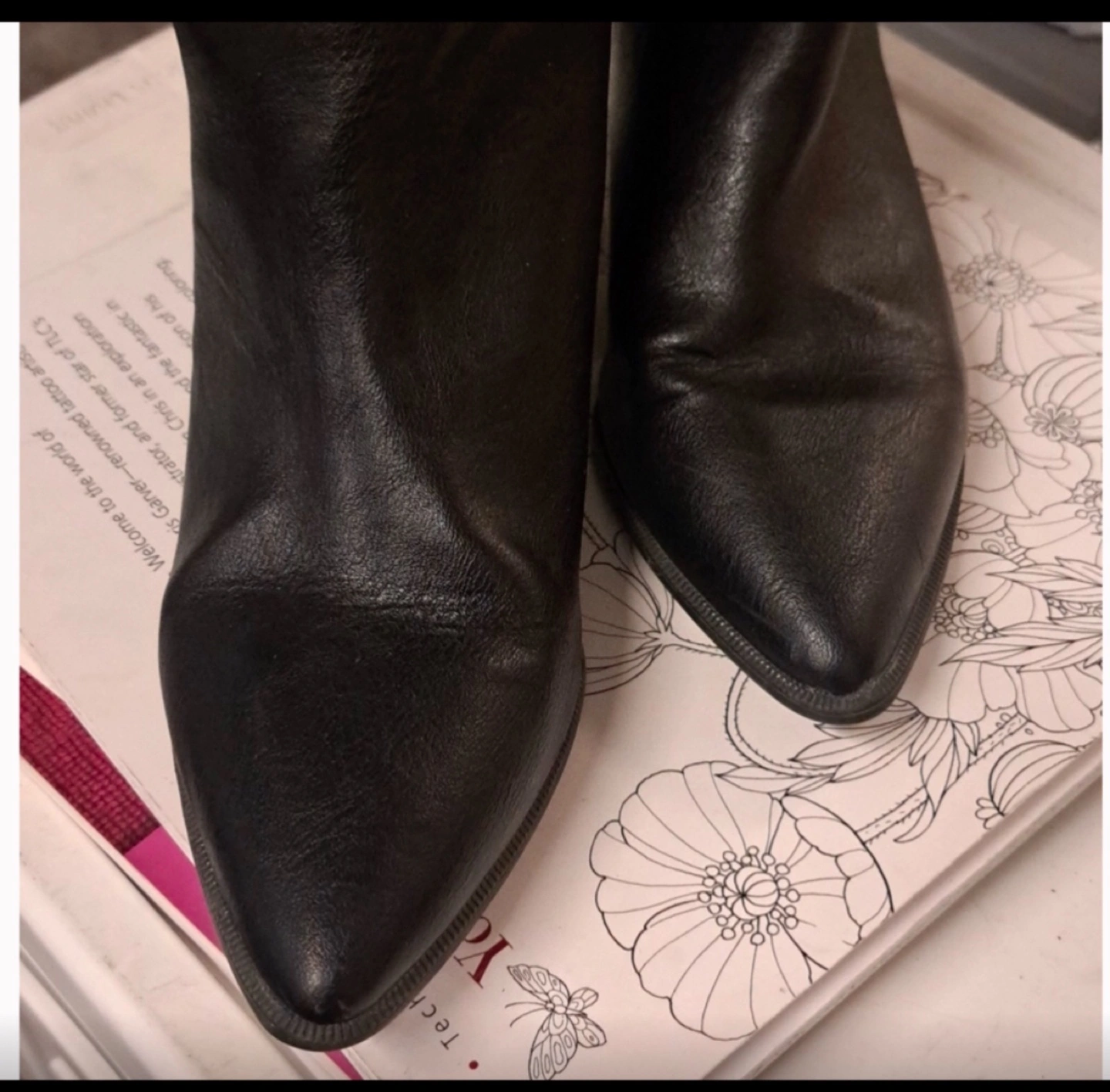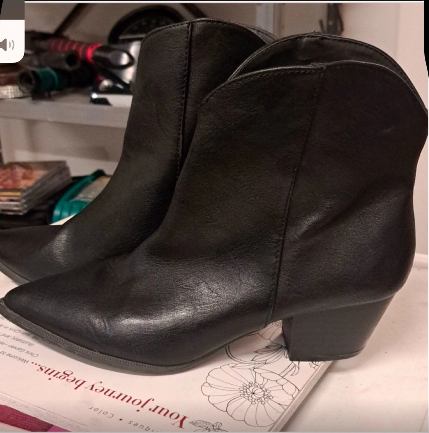 Pair of black leather ankle boots. Pointed toe. Low block heel. Good for fall and winter.