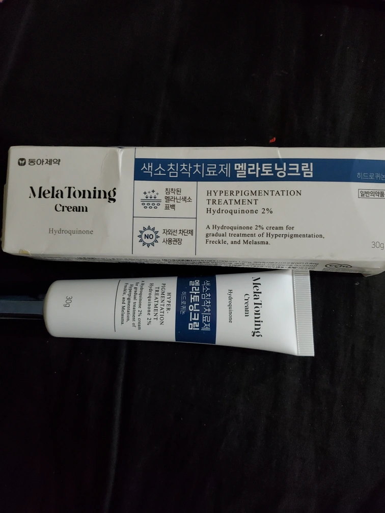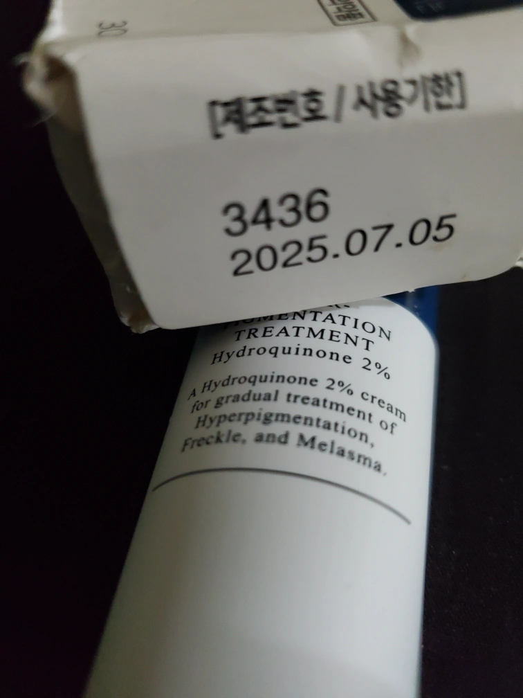 Hydroquinone 2% cream. Treats hyperpigmentation, freckles, and melasma. 30g tube. Expiry date 2025.07.05. I bought too many when I visited Korea. It is new in box.