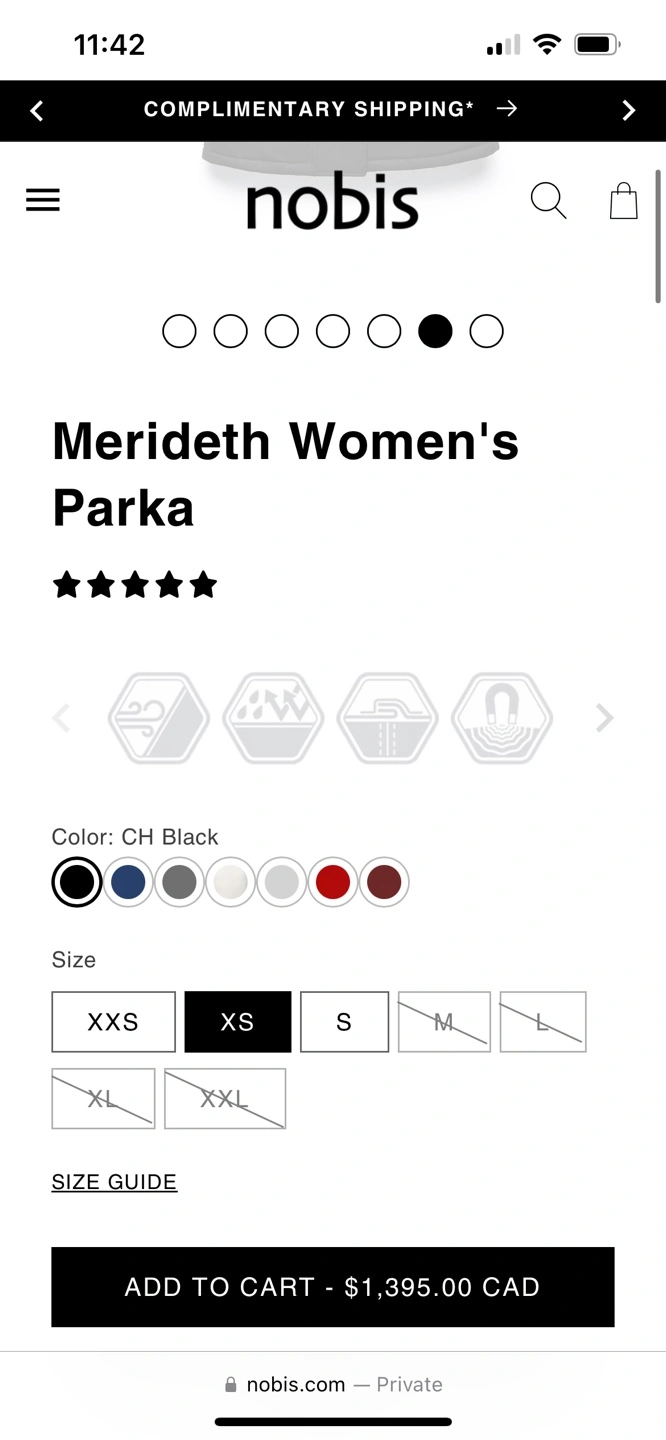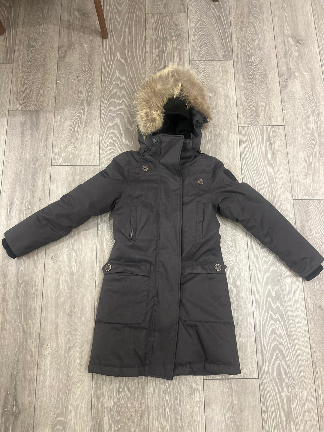 Women's long dark grey winter parka. Features a fur-trimmed hood and ribbed inner cuffs. Warm and stylish, ideal for cold Canadian winters. Zipper and snap magnetic closures. I usually wear a size small and x-small but purchased xxsmall for snug and slim look. Feel free to try it on before making your decision to purchase. Original price on nobis website is $1395.