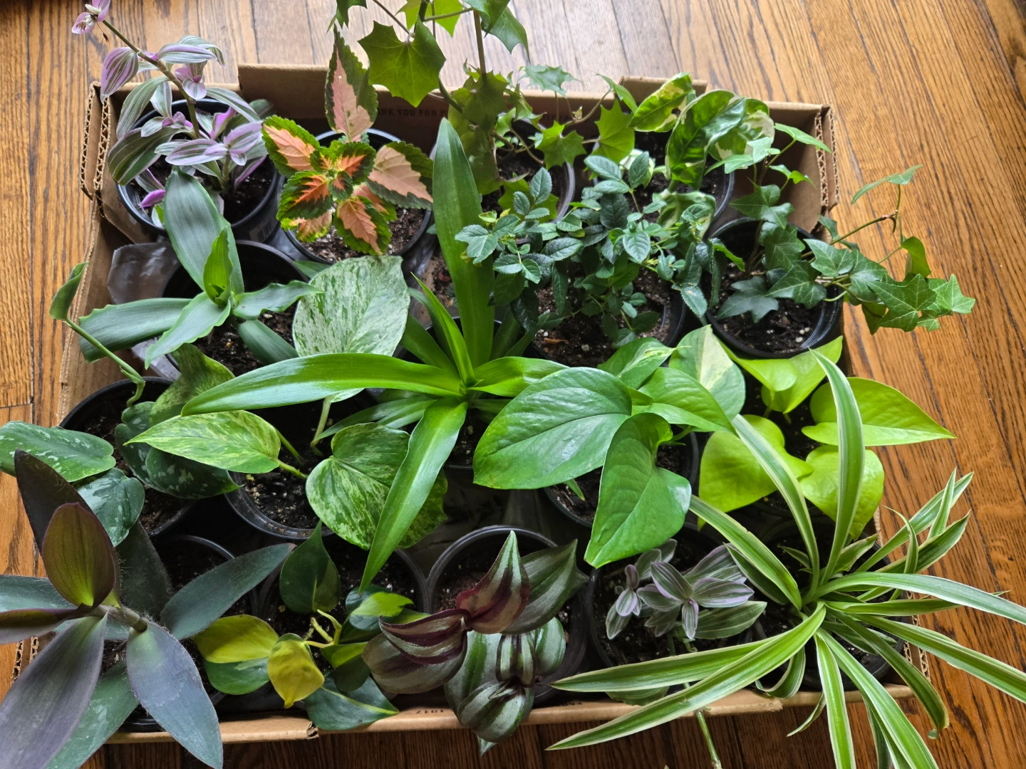 Collection of various small houseplants in individual pots. Many different types of foliage. Perfect for adding greenery to your home. First picture $3 each 3.5 inch pot. Second picture $5 each 4 inch pot. Spider plant Christmas cactus Coleus Wandering jew Purple heart Golden pothos Neno pothos Marble queen pothos Njoy pothos Silver satin pothos Aloe vera Murdannia loriformis Bright Star Umbrella plant Ivy - Enlish Ivy, Germany Ivy Tradescantia Nanouk Tradescantia Hybrid Hens and chicks Jade Mother of thousands Bamboo Kalanchoe Brasil Philodendron Haworthia Polka Dot Cati Prickly Pear