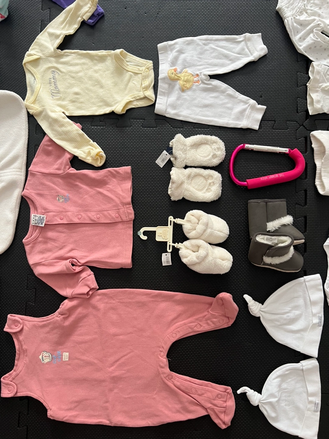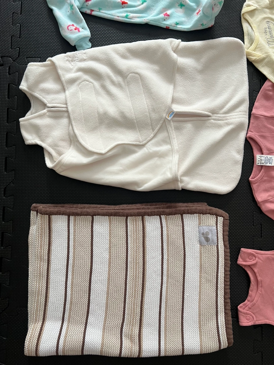 Listing includes a Fleece Halo Sleep Sack, Pink Mommy Hook, ‘Just Born’ blanket (perfect for car rides).