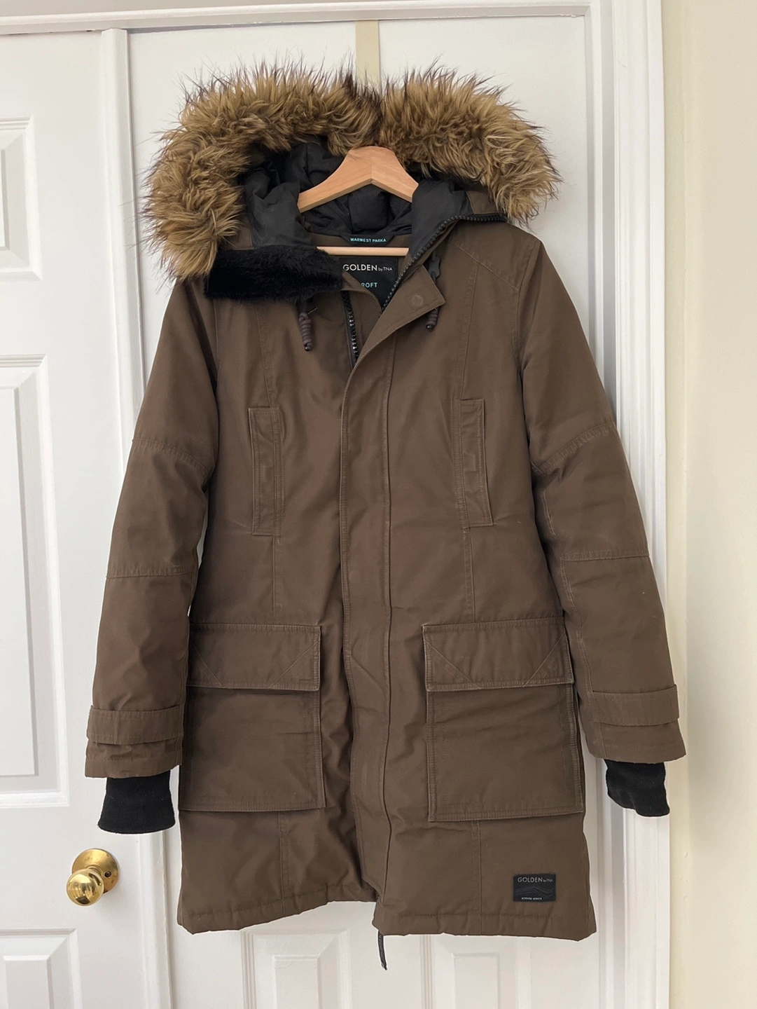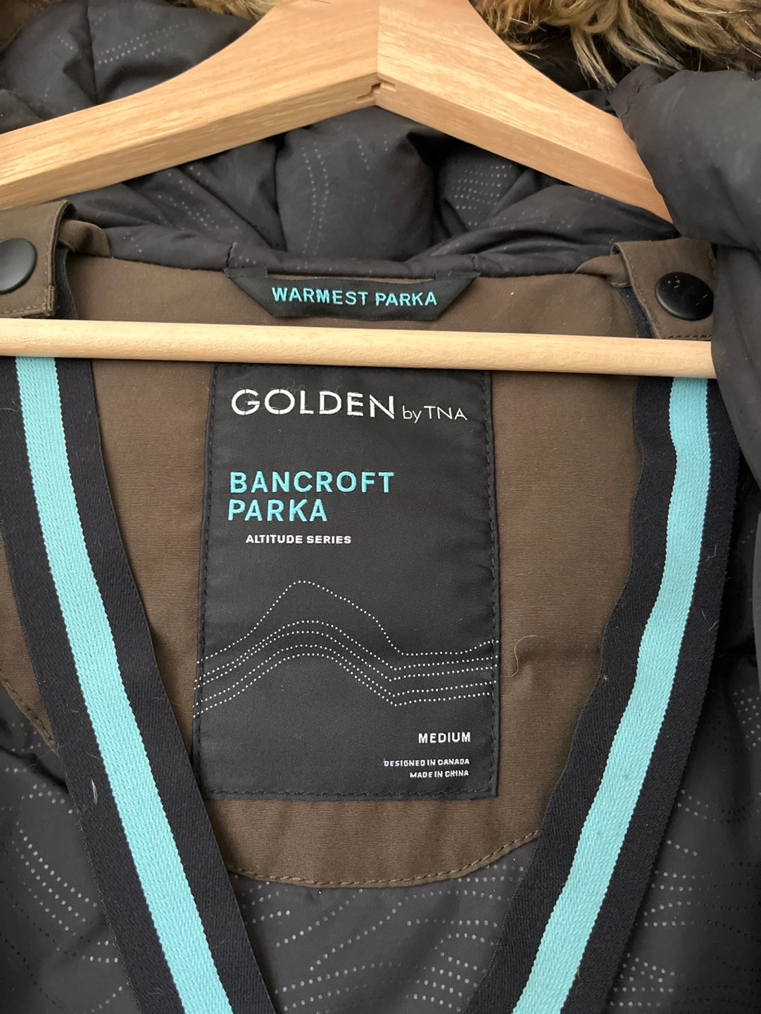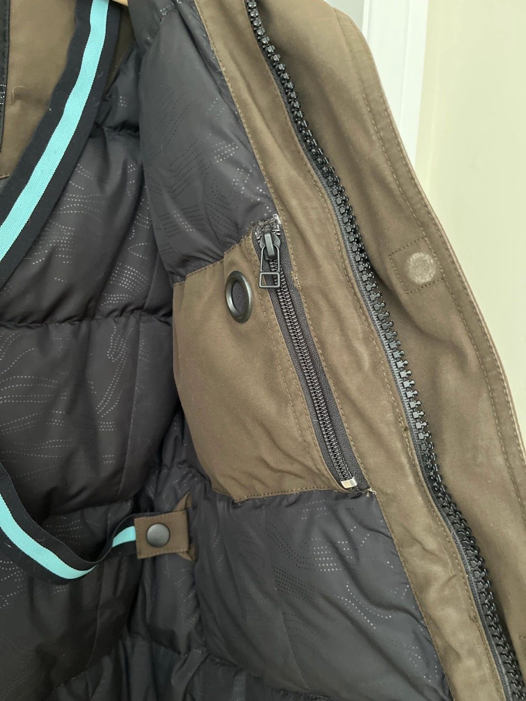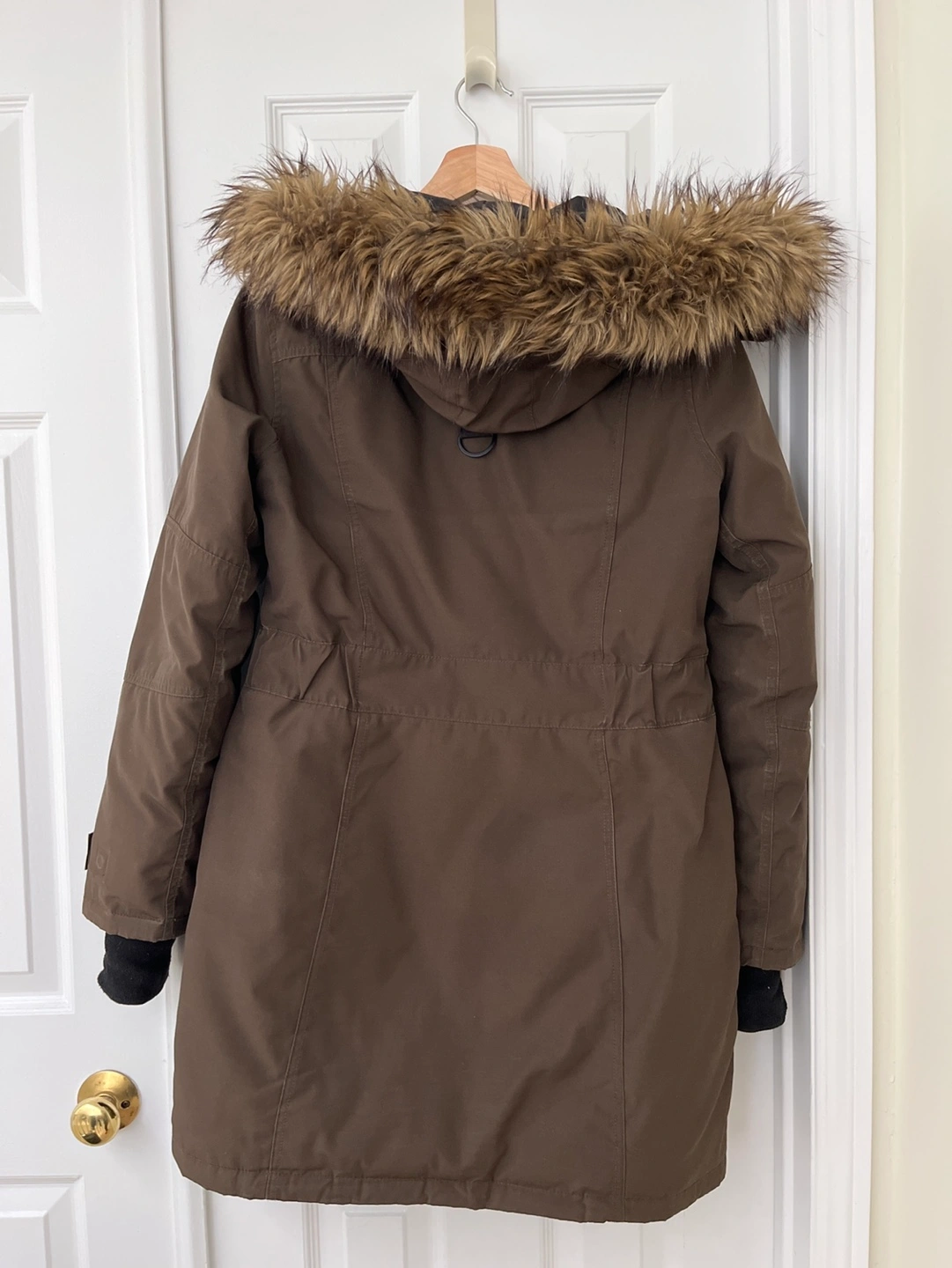 Warmest parka, Altitude series. Brown/dark green colour. Faux fur trim hood. Pockets featuring straps to wear on your back. Size medium.