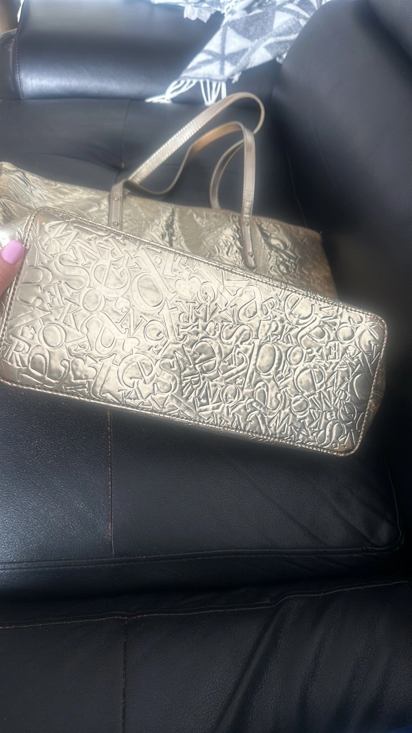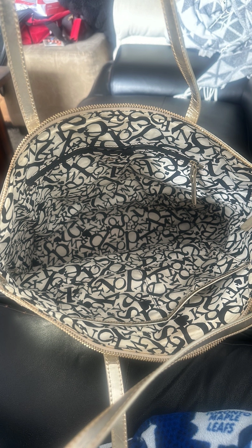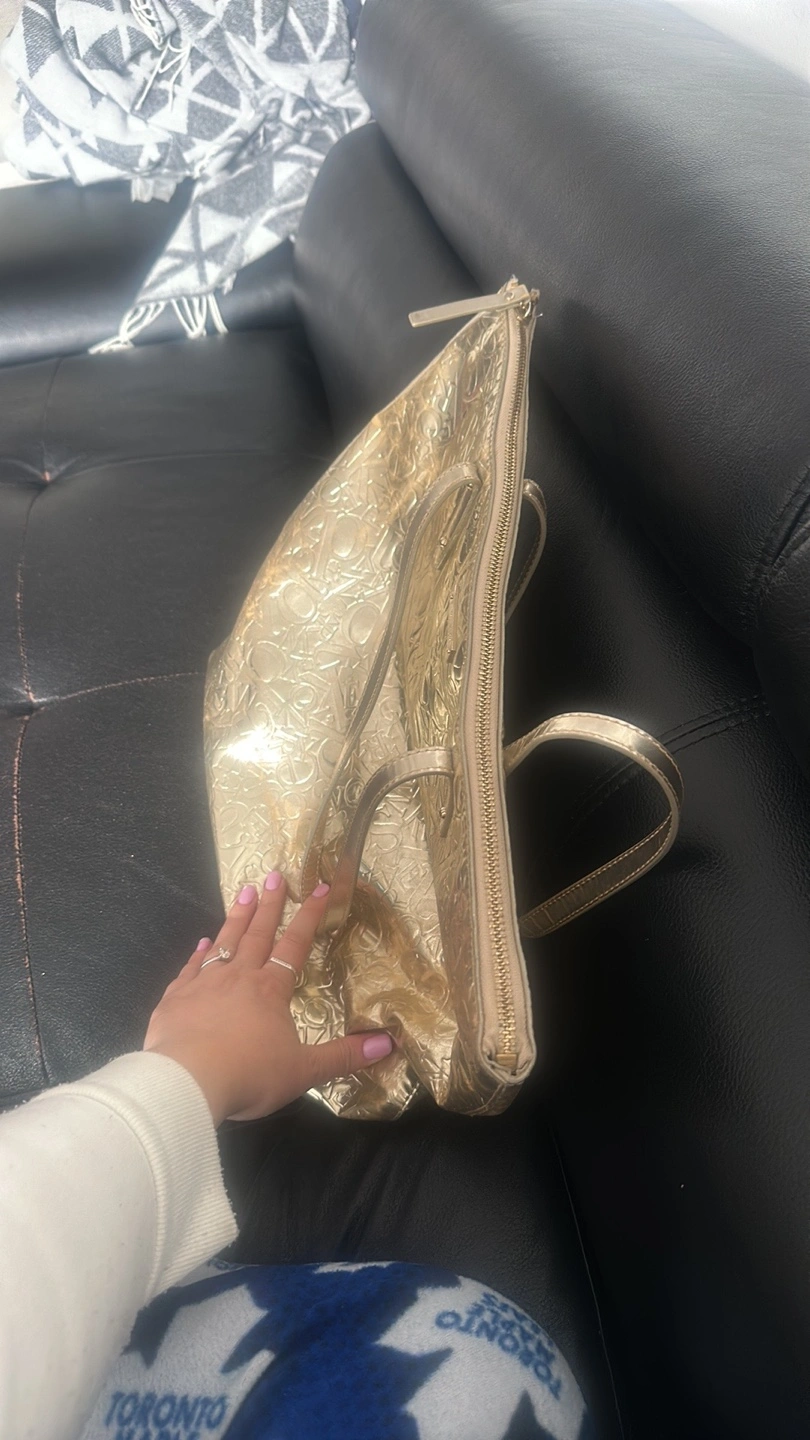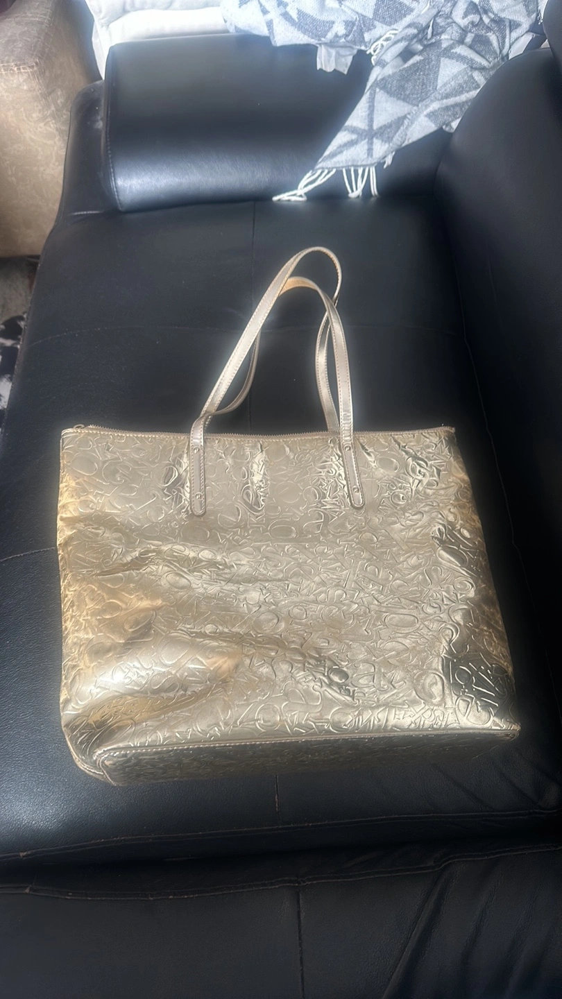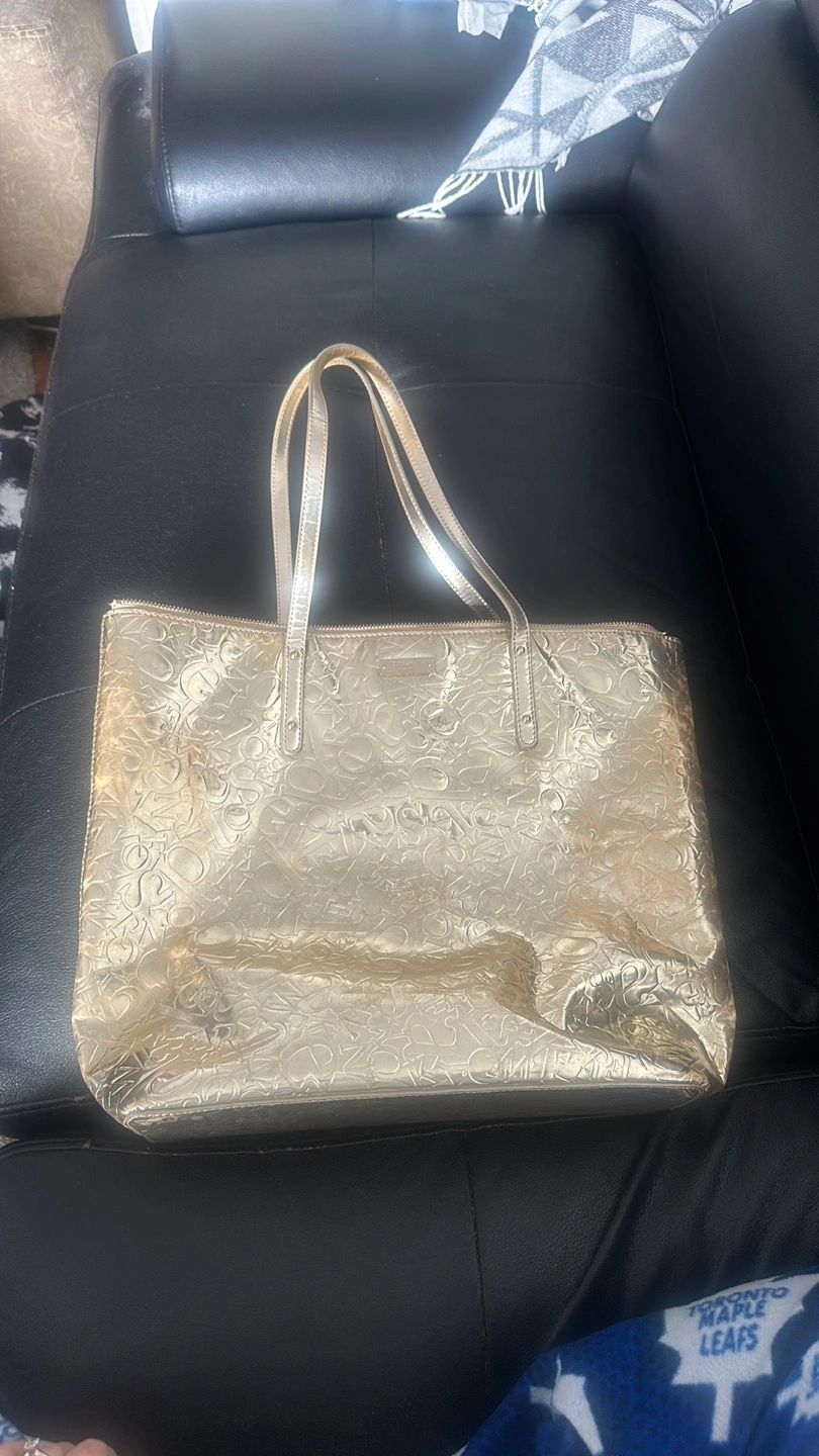 Gold tote bag. Embossed logo pattern. Zip closure. Two top handles. Interior lining.