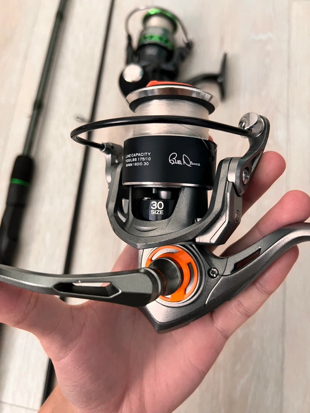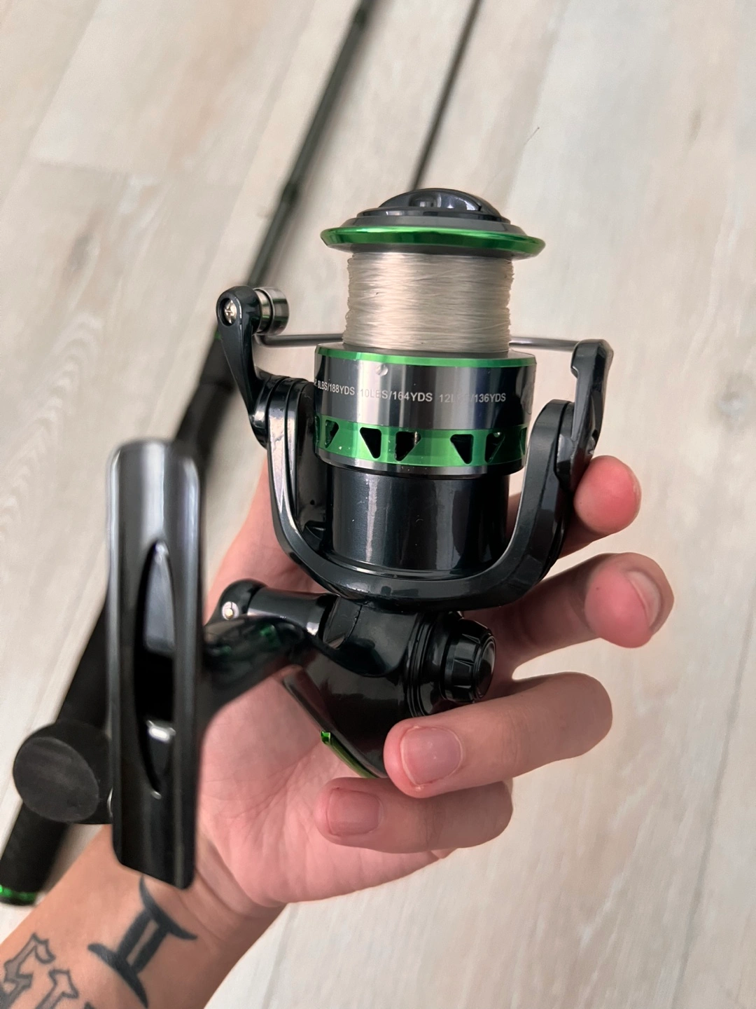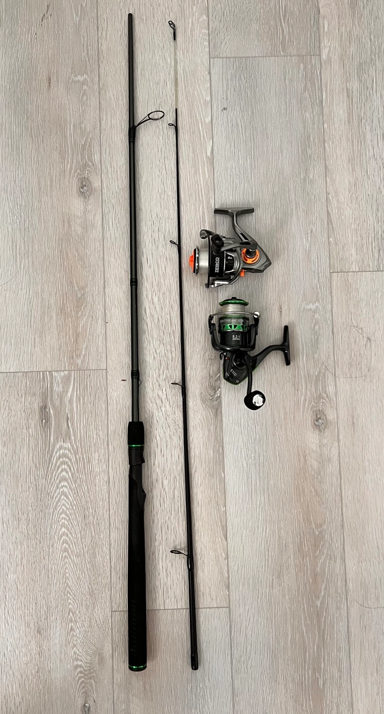 Both reels in good condition. The bass pro reel (green)is a little rusty. Just did the reel maintenance on both of them. The rod is in perfect condition.
