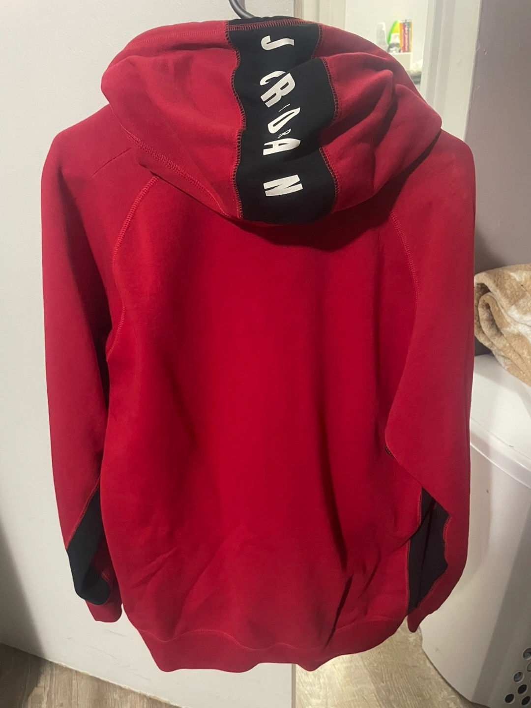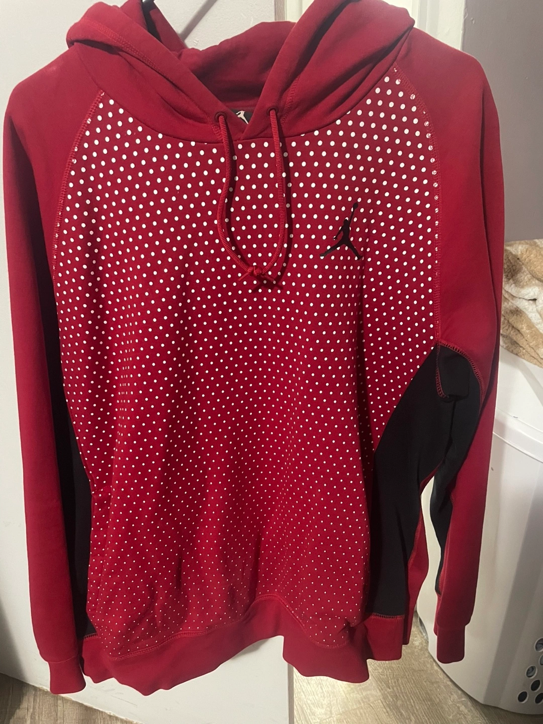 Men's Jordan Brand hoodie. Red with black accents. Features a white polka dot pattern and 'JORDAN' branding on the back of the hood Long sleeves, kangaroo pocket, drawstring hood, great condition!