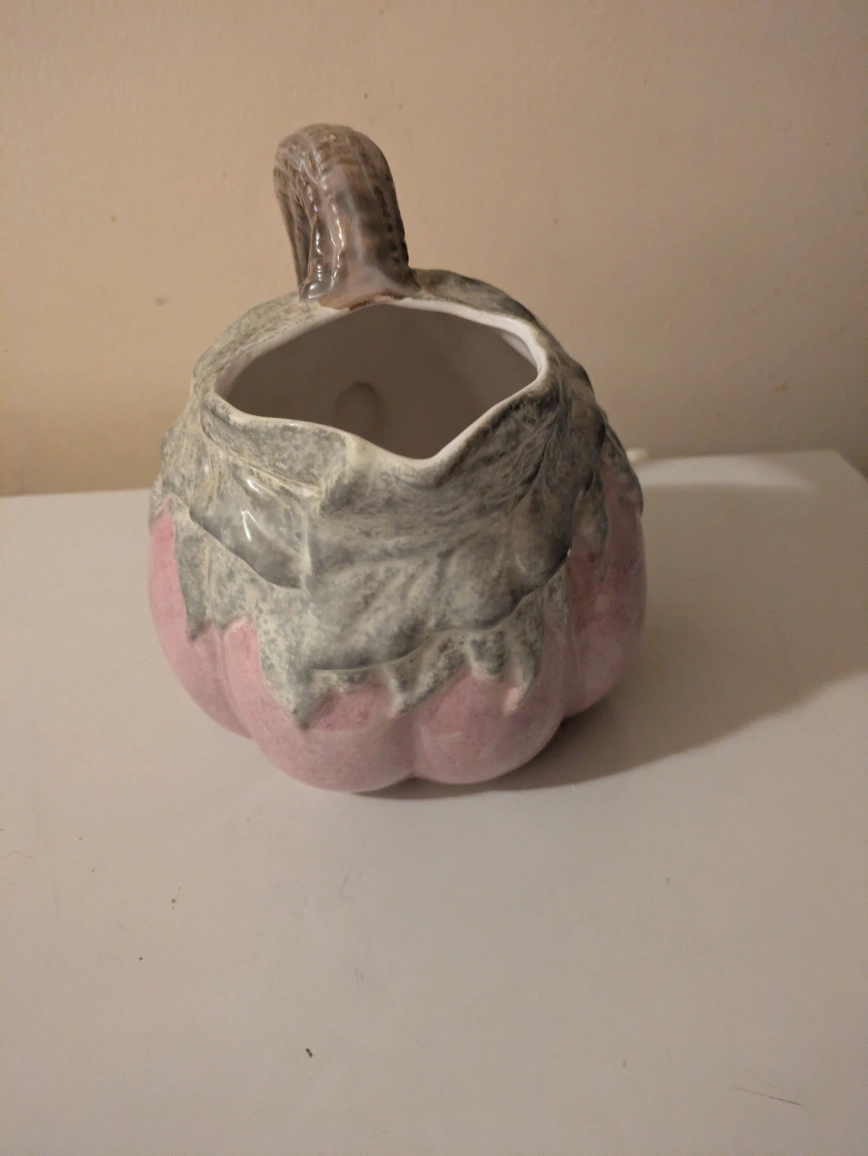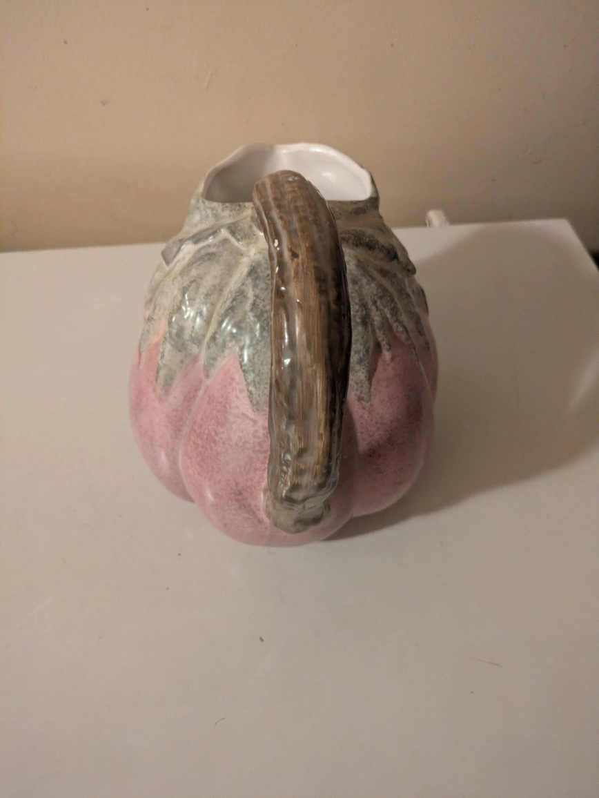 Unique 1970s ceramic pitcher. Light purple with green accents. Shaped like a eggplant. Features a rustic stem shaped handle. Decorative piece. Serious inquiries only. Quick reply.